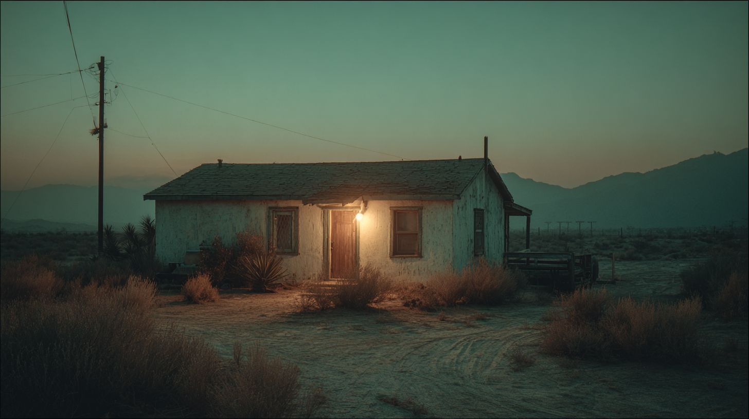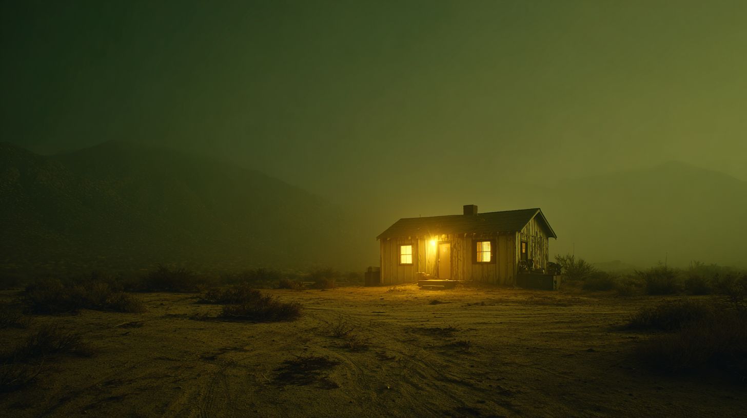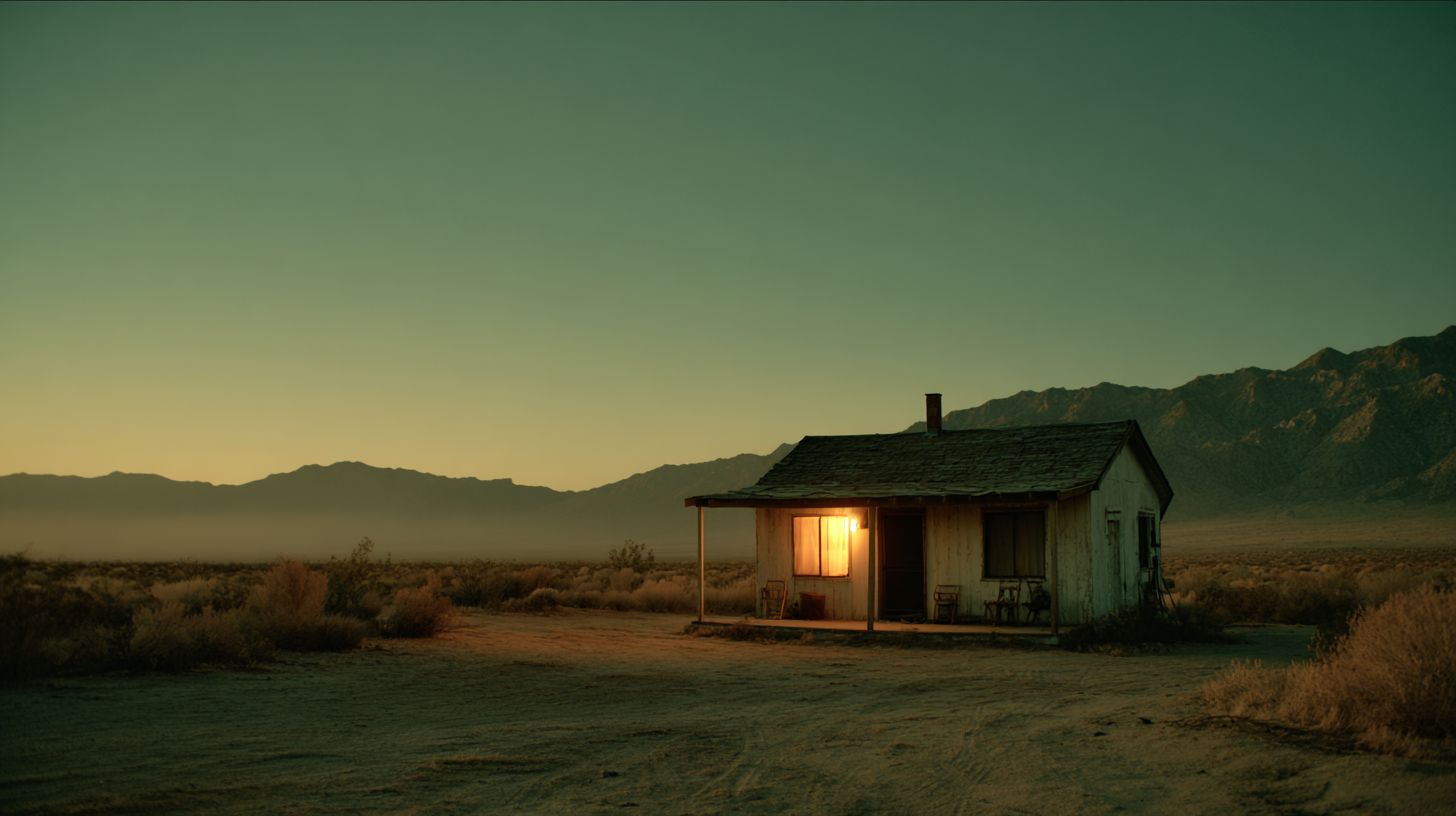 cinematic neo-western aesthetic, gritty realism, golden-hour desert lighting, high-contrast tones, dusty atmosphere, muted color palette with a greenish-yellow tint, vintage film grain, tension-filled composition, inspired by Breaking Bad cinematography Desert shack with a single light glowing inside --ar 16:9 --v 7.0