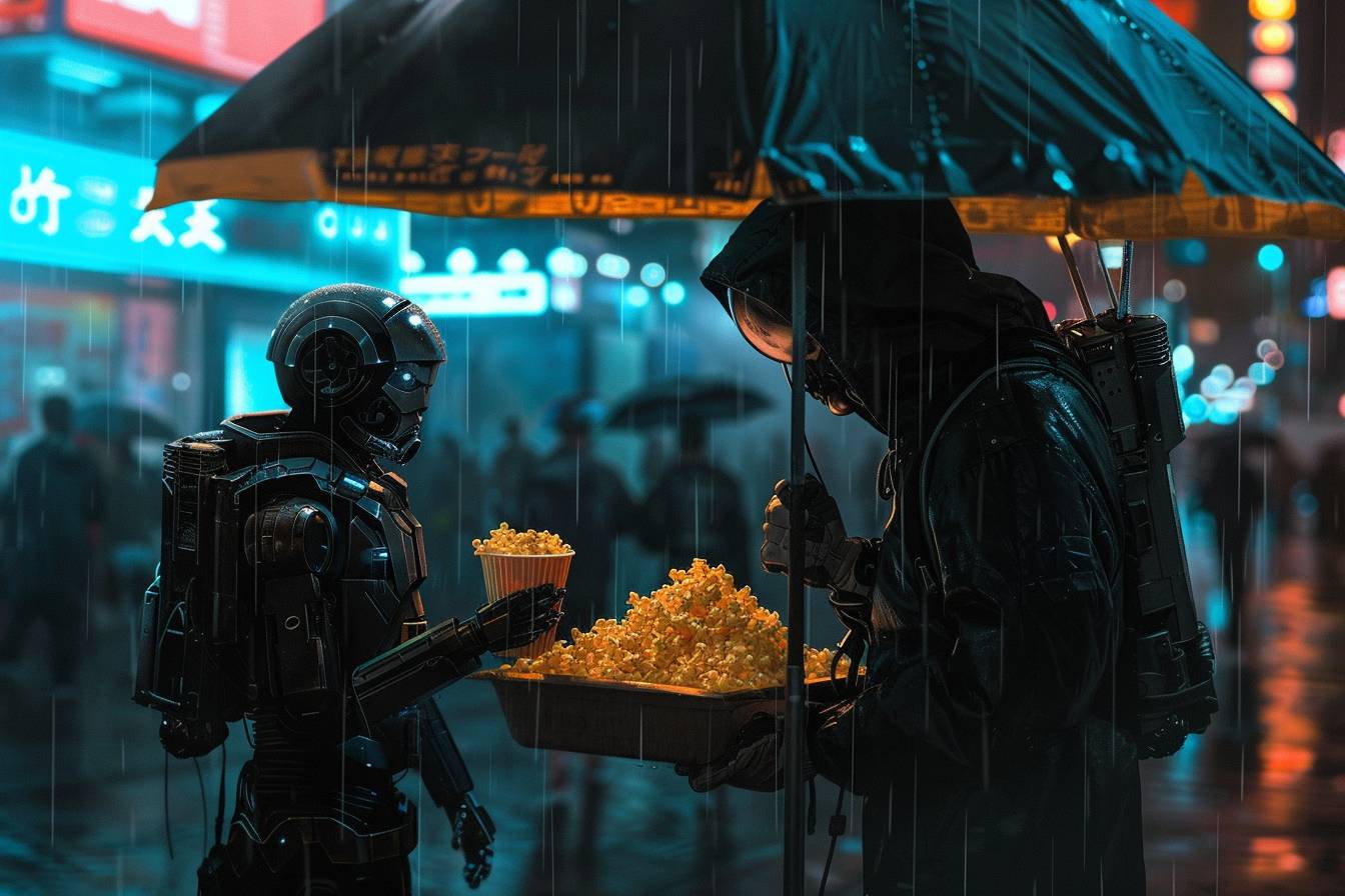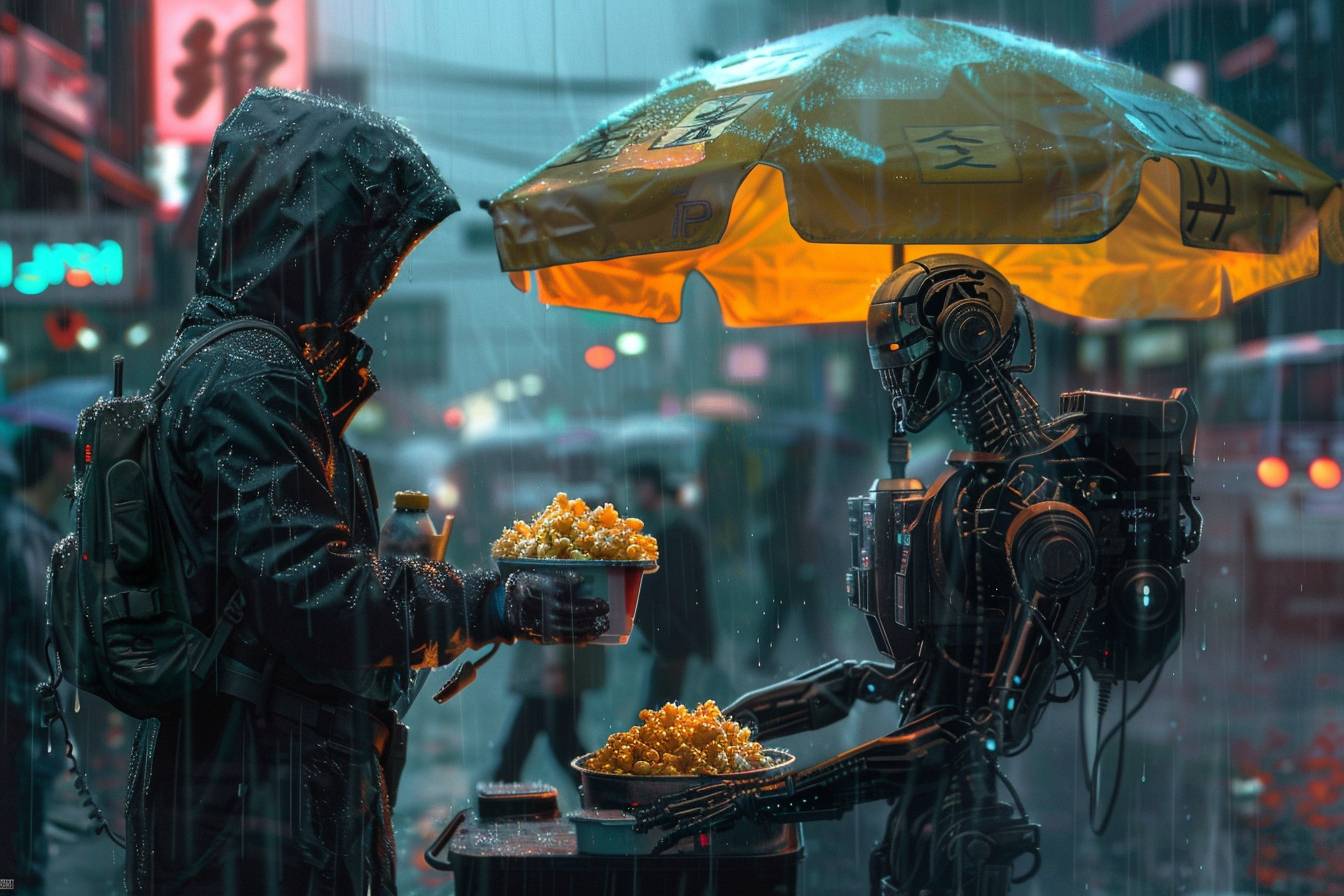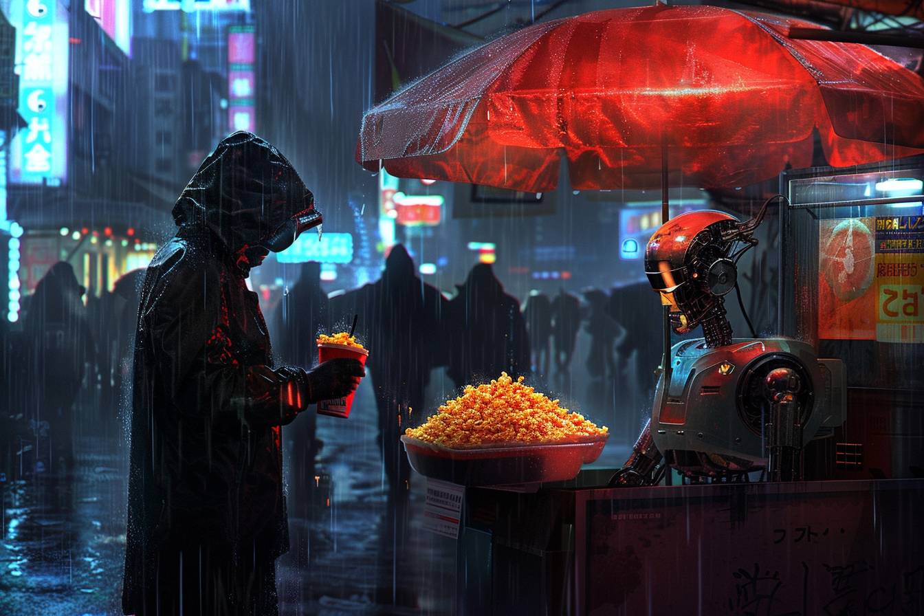 A street-food vendor selling popcorn to a robot in a rainy city, cyberpunk style.