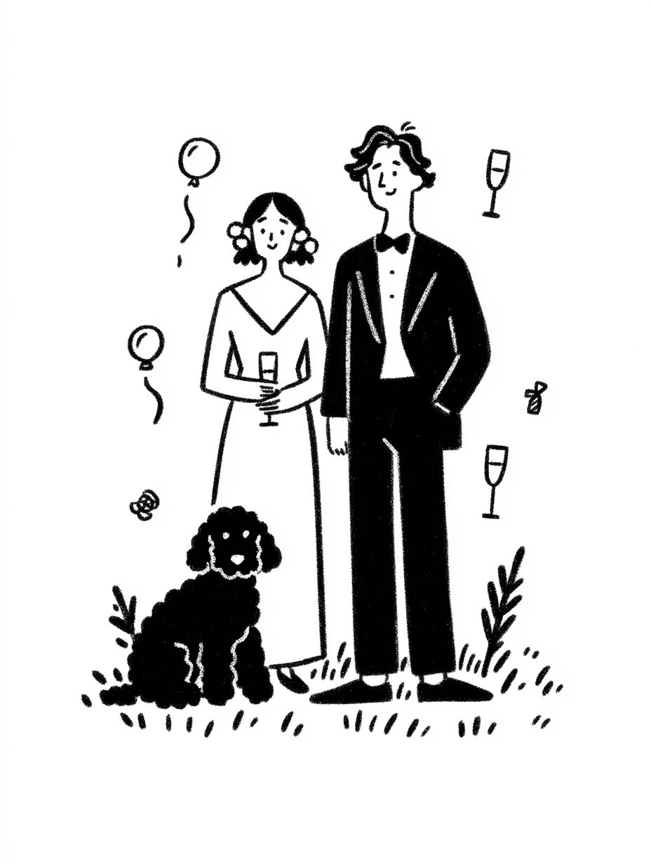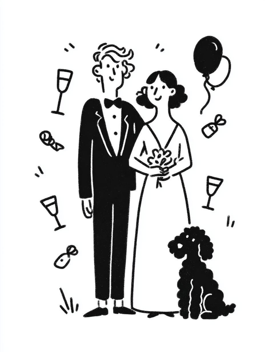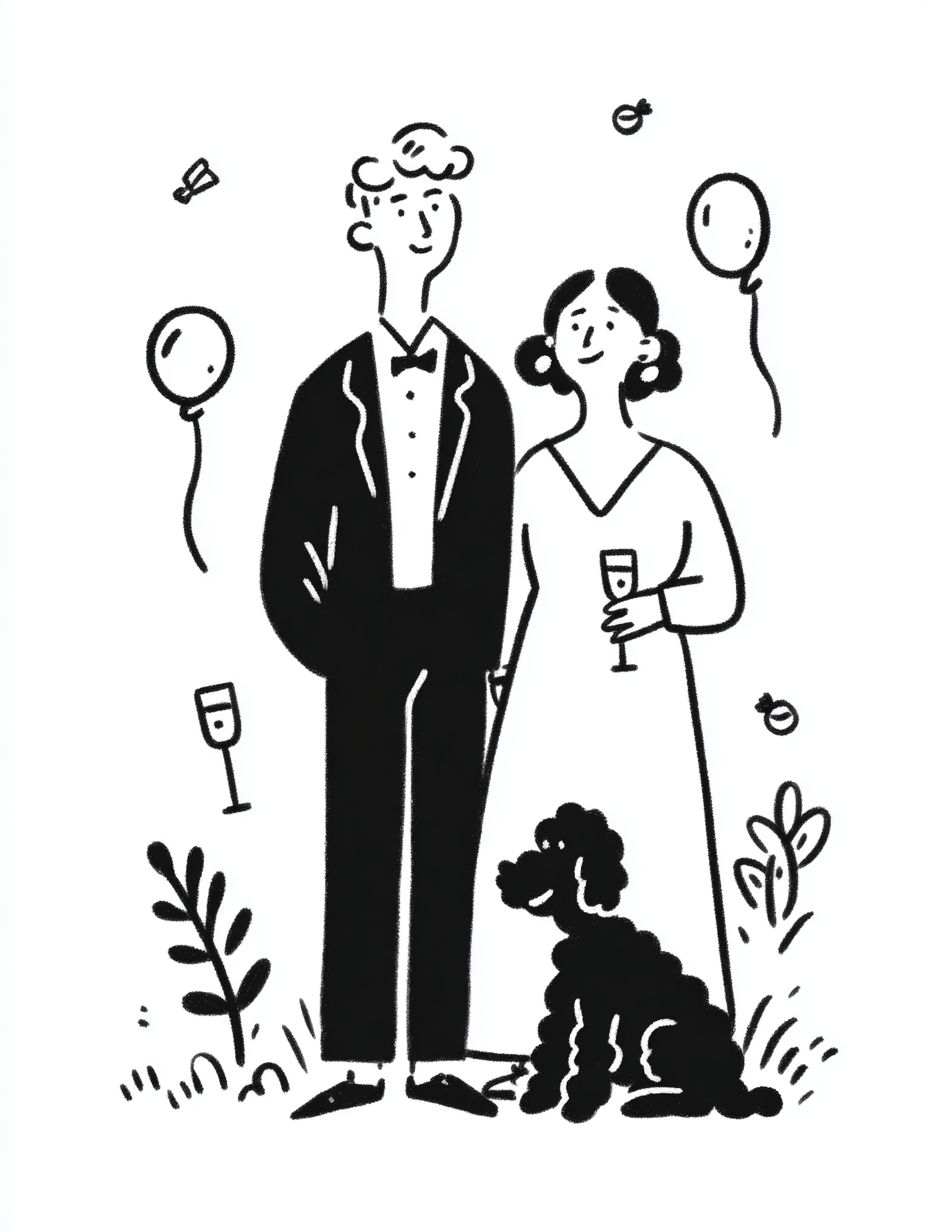 Detailed outline illustration, a couple stands on the lawn, the girl in a wedding dress and the boy in a tuxedo, with a curly-haired puppy by their side, surrounded by balloons, candy, and champagne glasses.