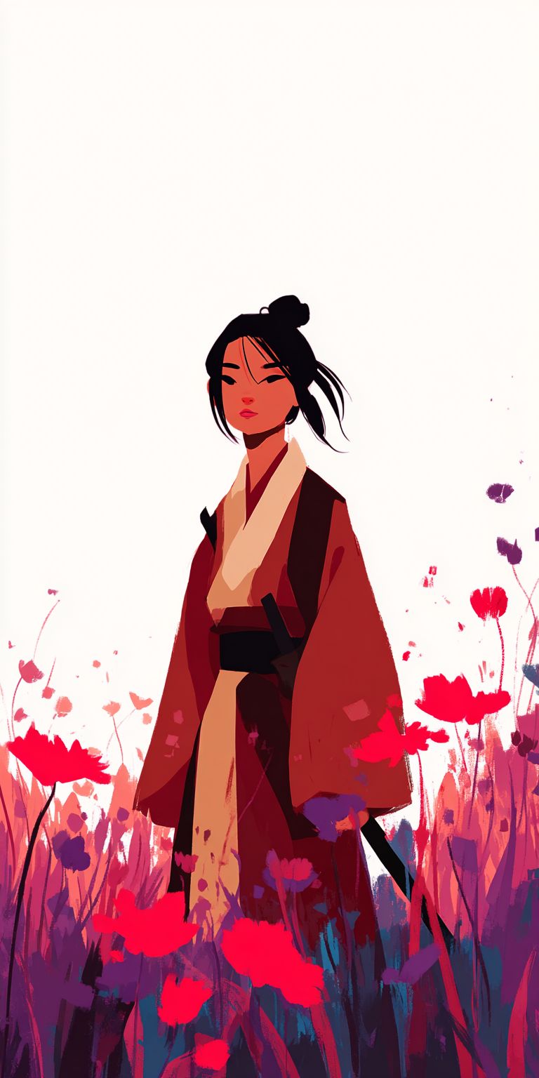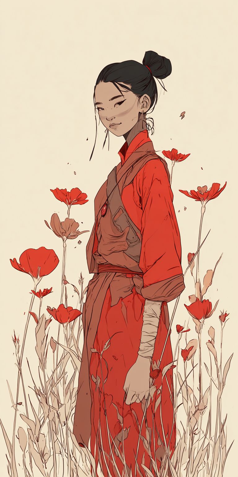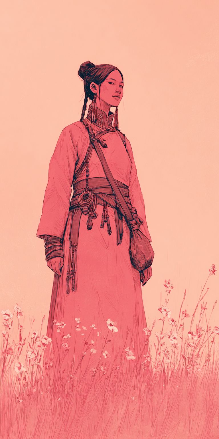 A calm Chinese female shaman standing with a faint smile in a field of flowers, procreate hand drawing. Digital art on plain background --ar 1:2 --raw --profile ovnyix3 --v 7.0