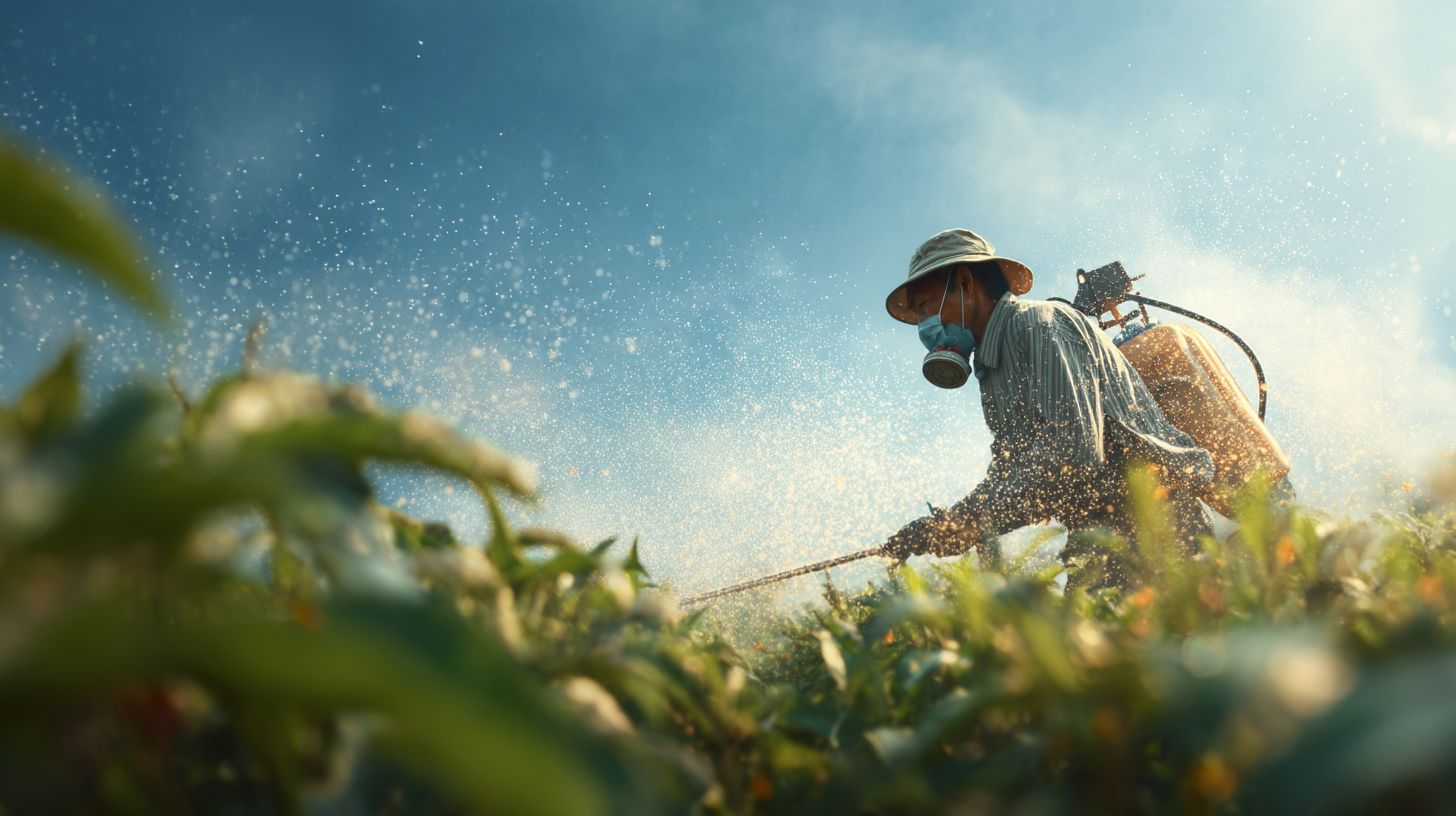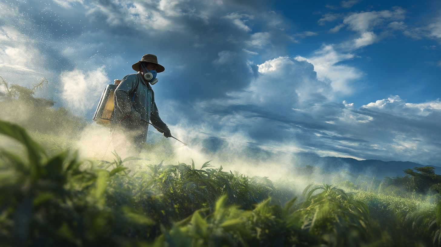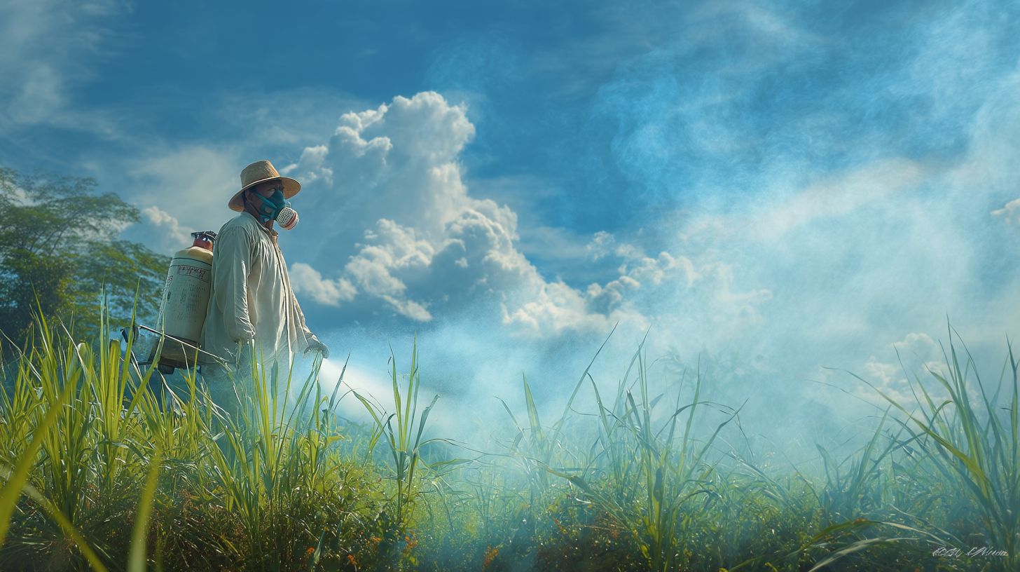 A Thai farmer spraying pesticide in rural fields wearing a long-sleeve shirt hat and mask