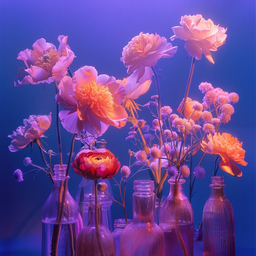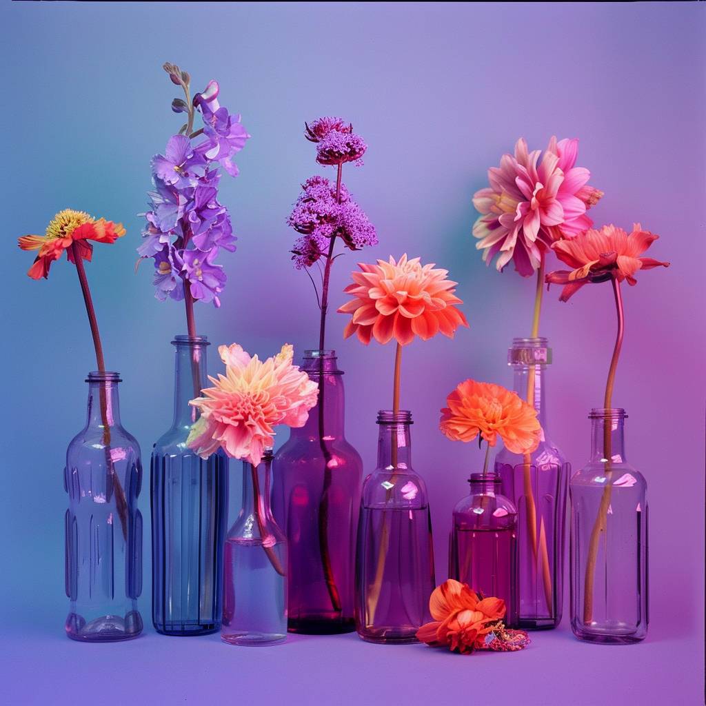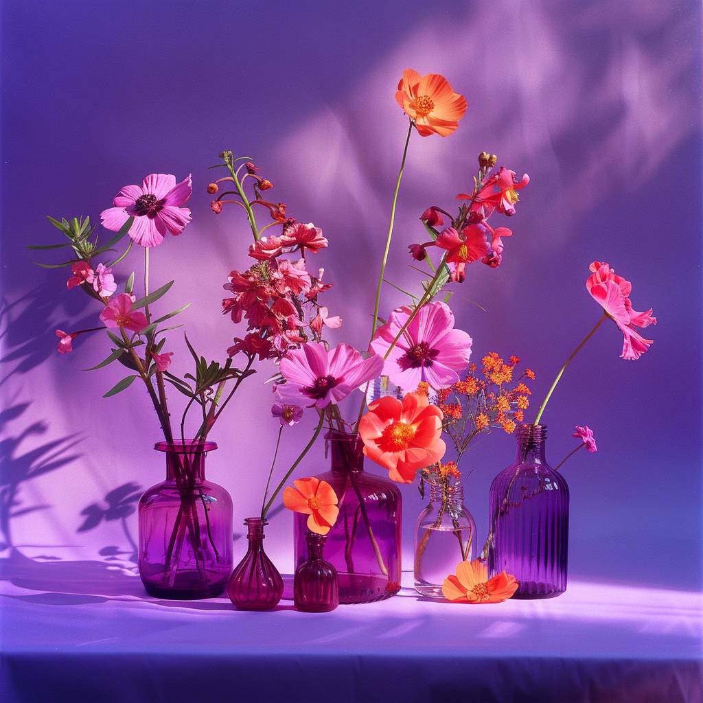 Conceptual still life photography, detailed, vivid pink and orange flowers in bottles, purple plain background, in the style of grainy filter, 80s sharp contrast --v 6.0