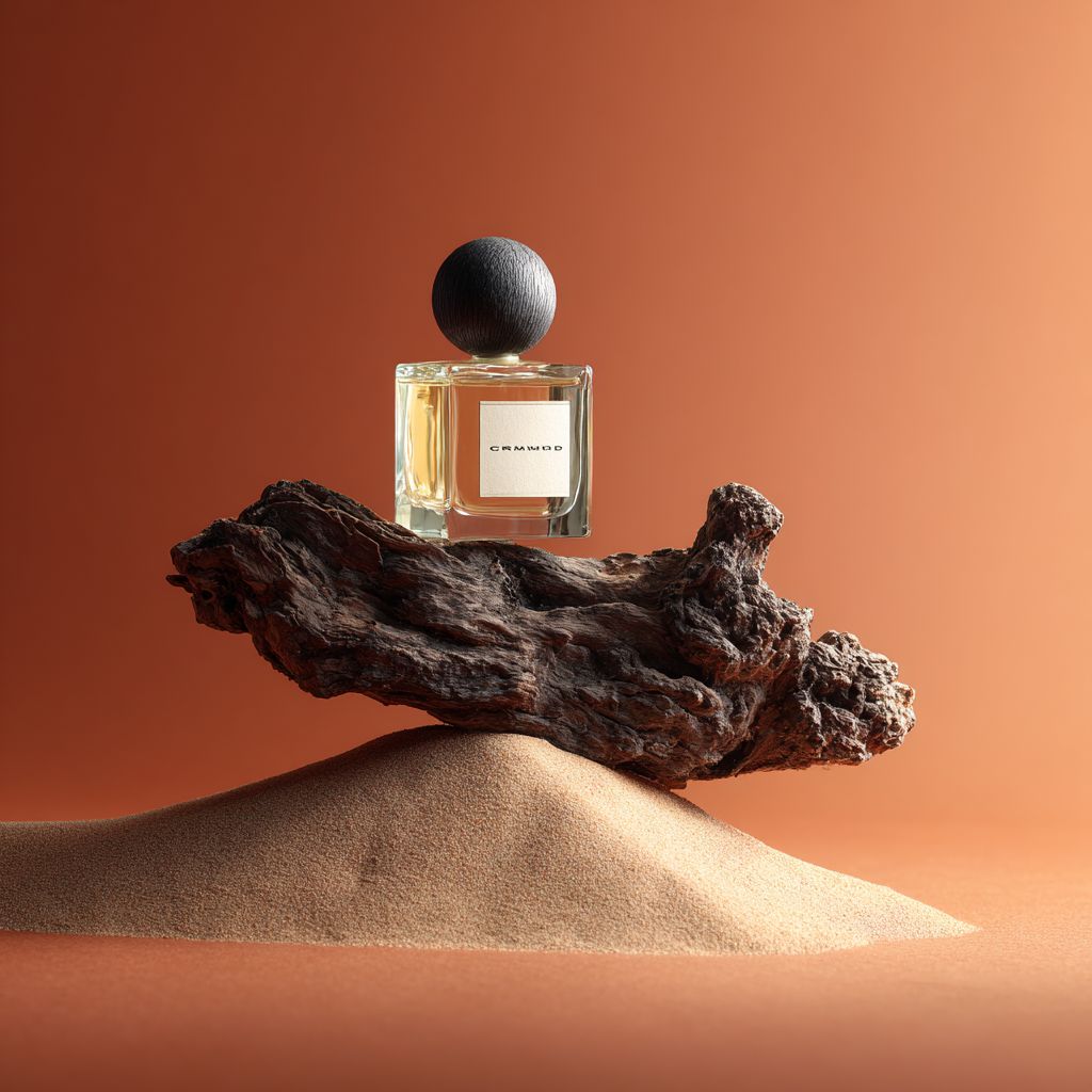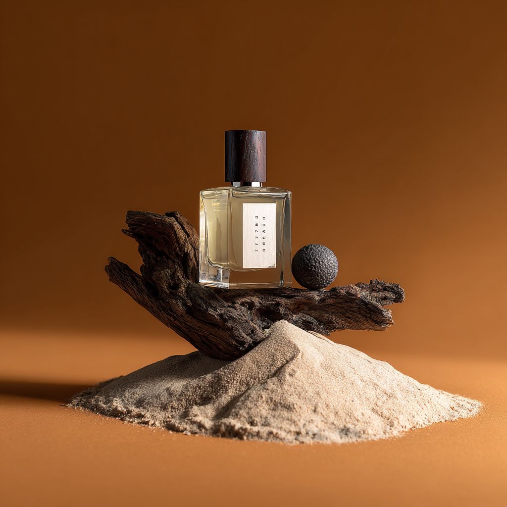 High-end product photography showcases the harmony between the perfume bottle and natural elements