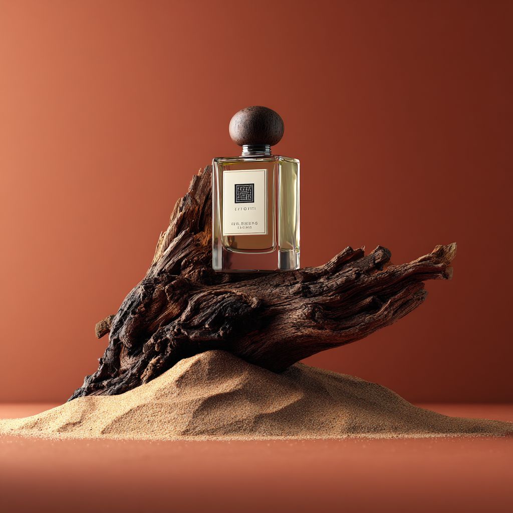 High-end product photography of a rectangular glass perfume bottle with a white label and a dark spherical cap. The bottle is elegantly balanced on a piece of dark, gnarled, textured driftwood. The driftwood rests on the peak of a perfectly shaped dune of fine, light-beige sand. The background is a solid, matte, warm terracotta-colored studio backdrop. The scene is lit with soft, clean, directional studio light, creating subtle shadows and emphasizing textures. Minimalist, luxury, earthy, sharp focus.