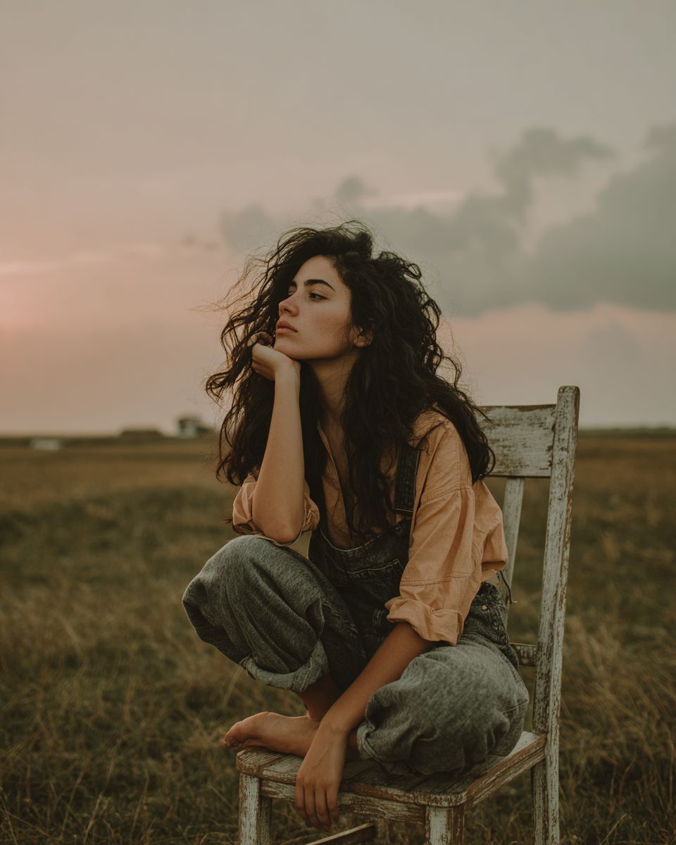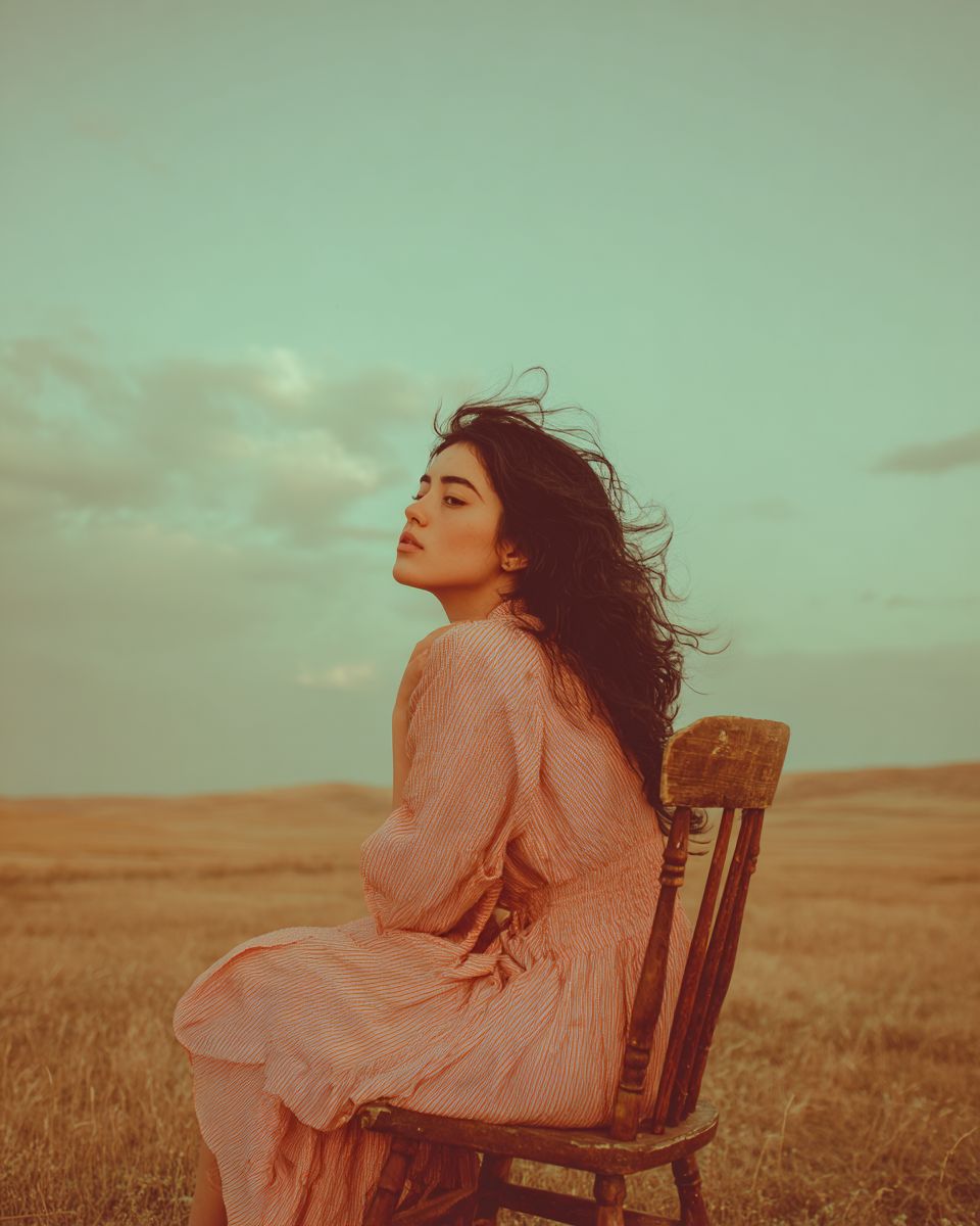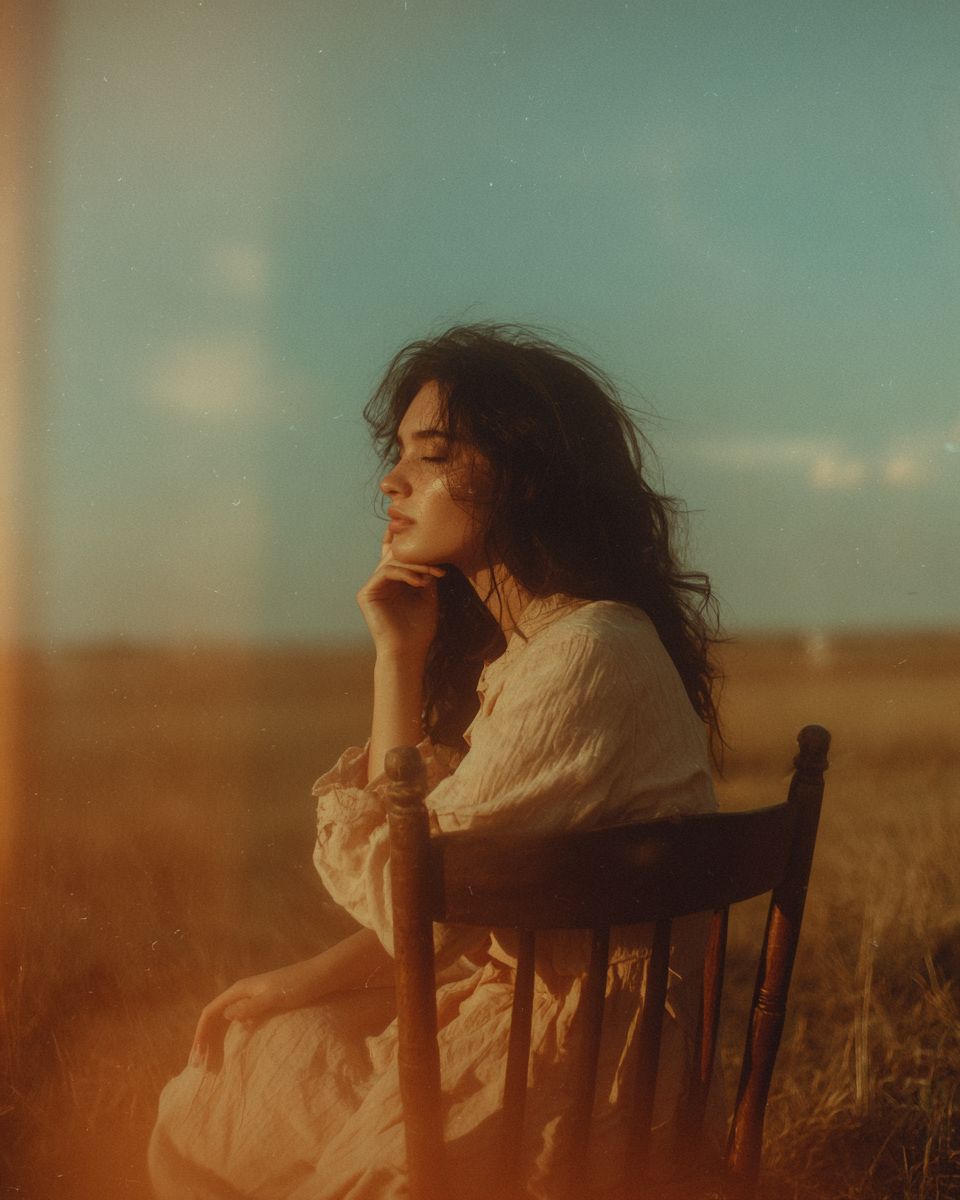 A natural 20-year-old girl with black wavy hair sitting on a wooden chair in a grassy field, touching her own hair, photographed from the side profile view. No makeup, natural beauty, looking down with downcast eyes, gazing into the distance, pensive expression, not looking at camera, casual relaxed pose, wearing modest clothing with low exposure, simple comfortable clothes. The photo was taken from far away, wide shot showing full body including feet, distant view, small figure in vast landscape, lots of negative space, emphasis on the landscape, with warm muted colors and soft desaturated tones. Vintage film aesthetic, shot on expired 35mm film, soft focus with shallow depth of field, film grain and light leaks, nostalgic 70s color palette, slight vignetting, organic imperfections, warm peachy and coral tones with dusty blue sky, analog photography feel, grainy texture, cinematic quality, dreamy atmosphere. --ar 4:5 --v 7.0