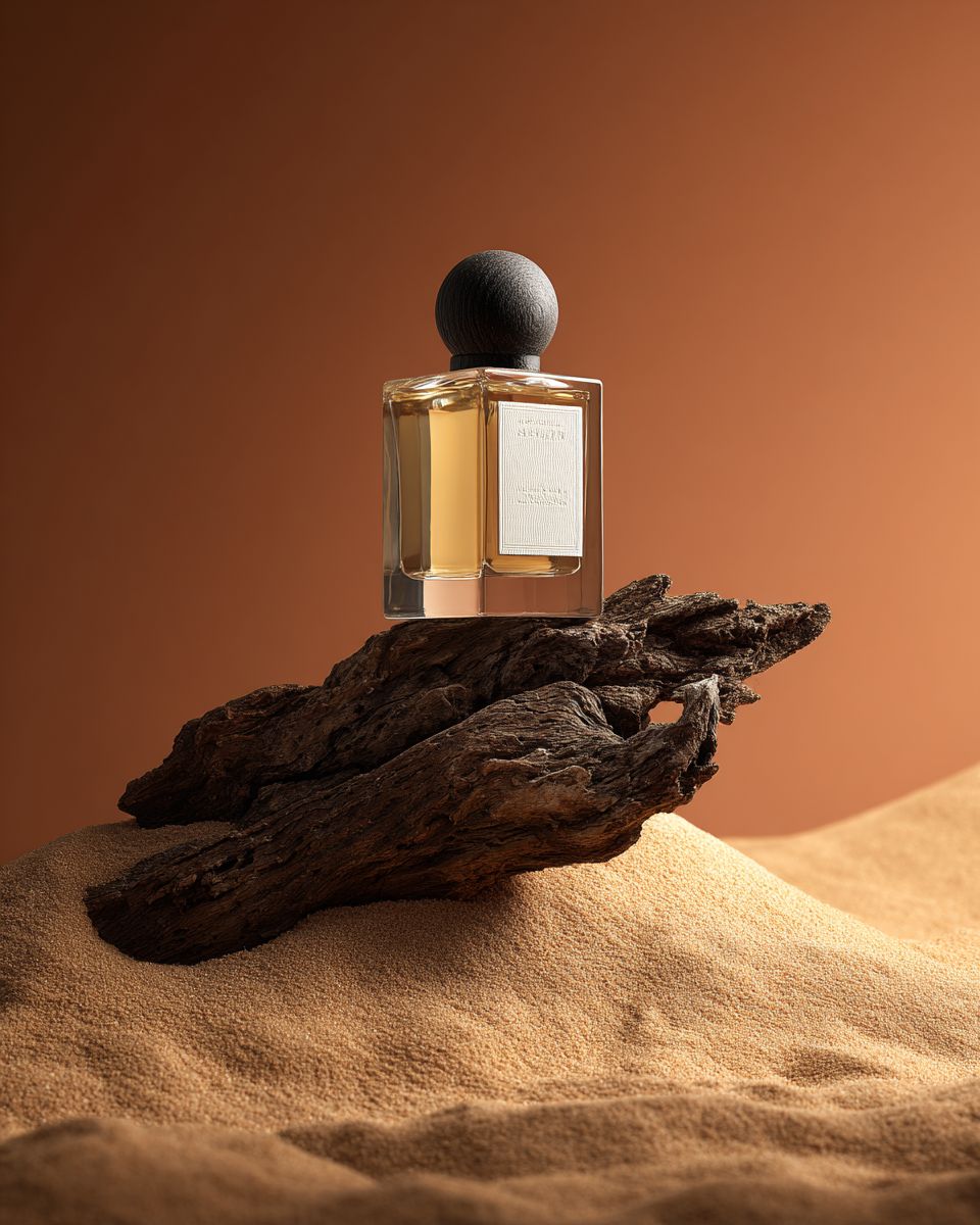 High-end product photography of a rectangular glass perfume bottle with a white label and dark spherical cap