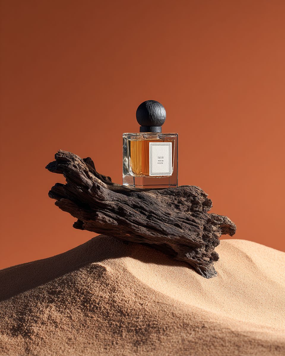 High-end product photography of a rectangular glass perfume bottle with a white label and a dark spherical cap. The bottle is elegantly balanced on a piece of dark, gnarled, textured driftwood. The driftwood rests on the peak of a perfectly shaped dune of fine, light-beige sand. The background is a solid, matte, warm terracotta-colored studio backdrop. The scene is lit with soft, clean, directional studio light, creating subtle shadows and emphasizing textures. Minimalist, luxury, earthy, sharp focus. --ar 4:5 --v 7.0