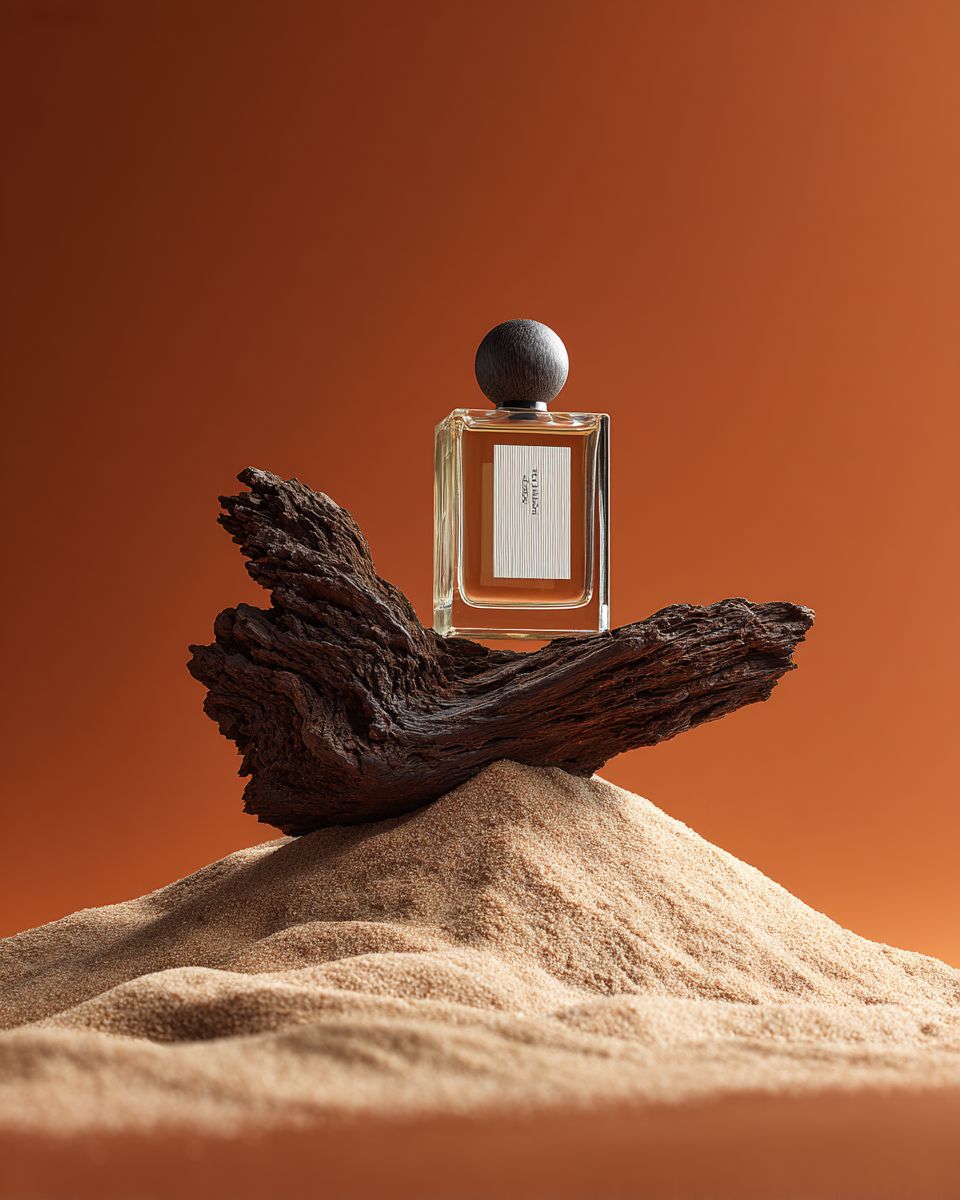 High-end product photography of a rectangular glass perfume bottle with a white label and a dark spherical cap. The bottle is elegantly balanced on a piece of dark, gnarled, textured driftwood. The driftwood rests on the peak of a perfectly shaped dune of fine, light-beige sand. The background is a solid, matte, warm terracotta-colored studio backdrop. The scene is lit with soft, clean, directional studio light, creating subtle shadows and emphasizing textures. Minimalist, luxury, earthy, sharp focus.