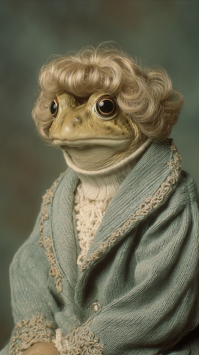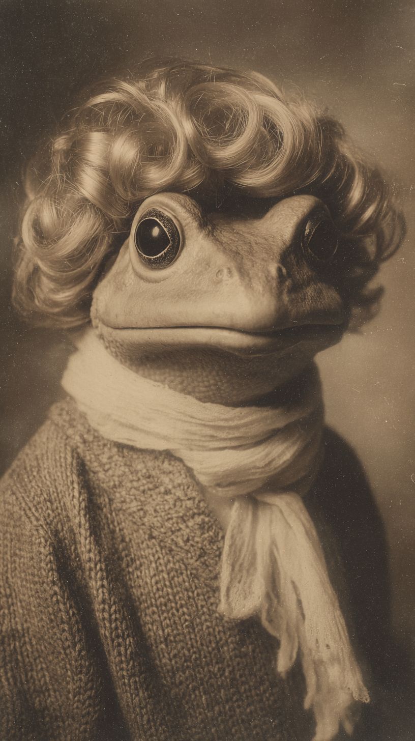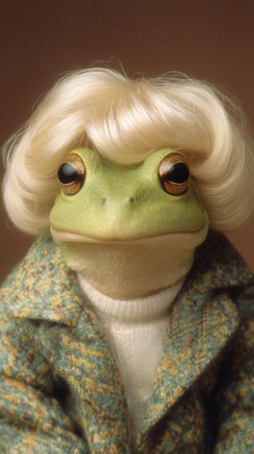 frog wearing a bob hair wig. In the style of a photo studio photograph from 1990s --ar 9:16 --v 7.0