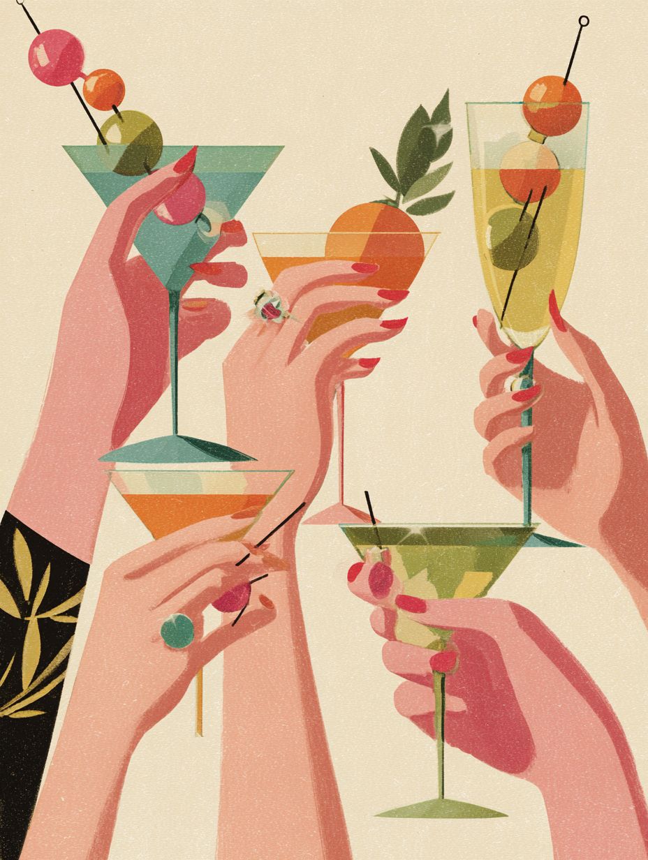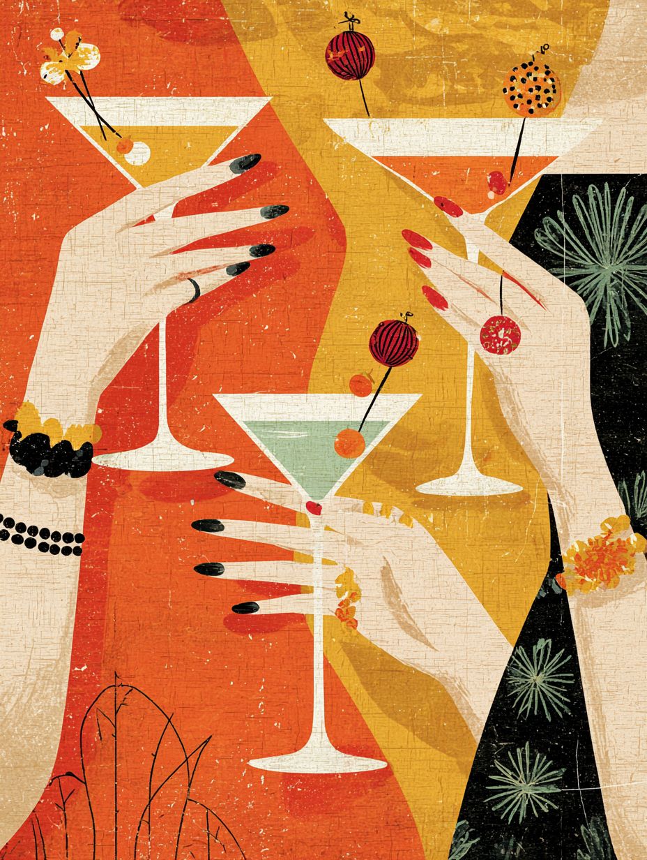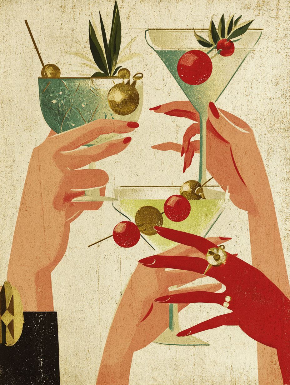 Retro vintage illustration, 1960s cocktail party style, three elegant hands holding champagne glasses and martini glasses, martini glasses garnished with Christmas ornaments on toothpicks instead of olives, bold glamorous minimal, glamorous mid-century aesthetic, sharp details, playful surrealism, stylish and sophisticated (no typography)