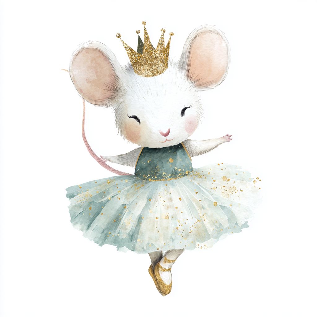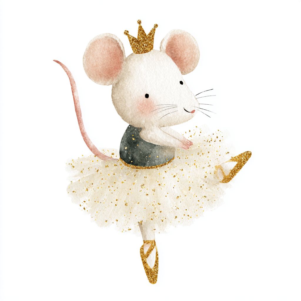 Cute watercolor clipart of a cute mouse ballerina with crown gold glitter elements ,pastel , delicate texture, illustration style, by jon klassen isolated on white background --v 7.0