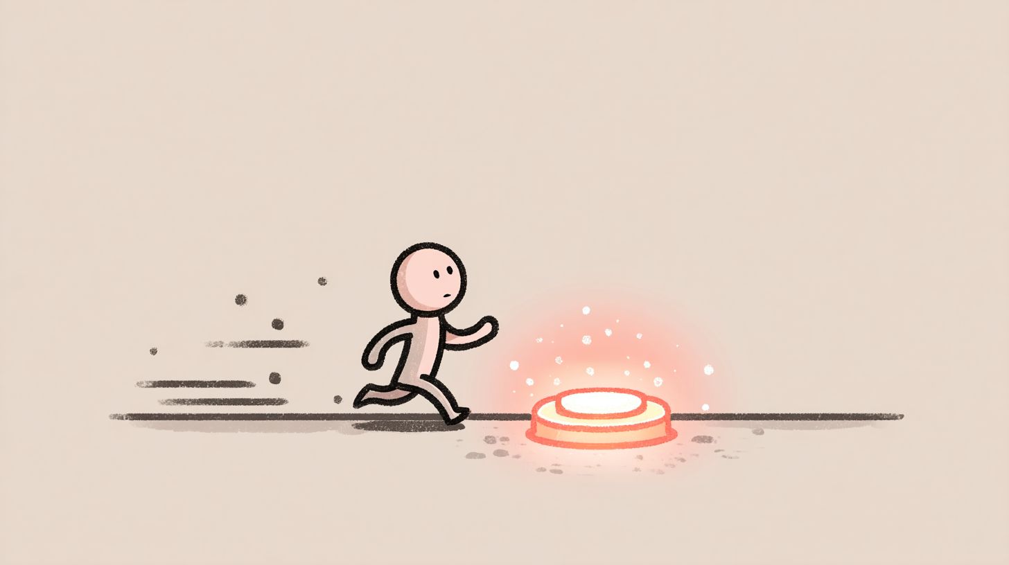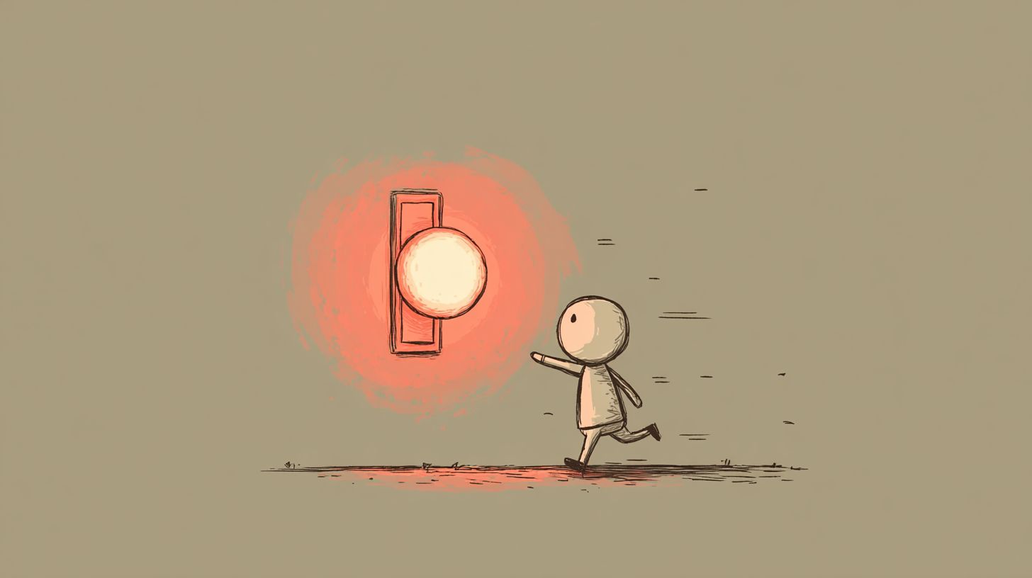 A stick figure pressing a large glowing button metaphorically labeled 'action', symbolizing flipping paralysis into momentum, minimalist clean line drawing with subtle glowing aura and motion lines.