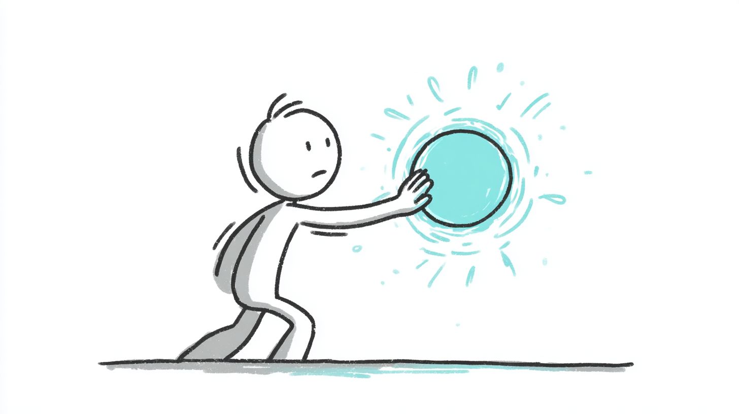 A stick figure pressing a large glowing button labeled metaphorically as 'action', symbolizing flipping paralysis into momentum, minimalist clean line drawing with subtle glowing aura and motion lines.. Cartoon Style, Stick Figure Art, Basic Drawing --no shading, realistic details, 3d rendering, gradients, complex background, hand, fingers, pencil, pen, artist, text, letters, writing, words, font, signature --chaos 10 --ar 16:9 --stylize 150 --v 7.0