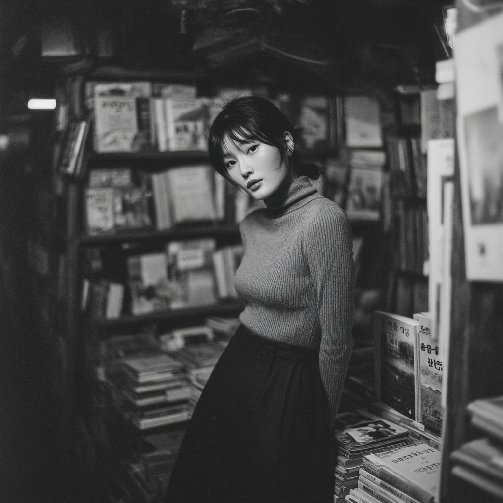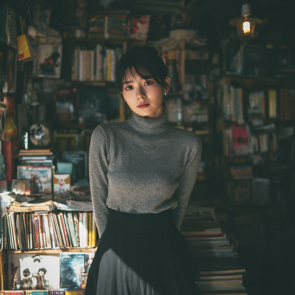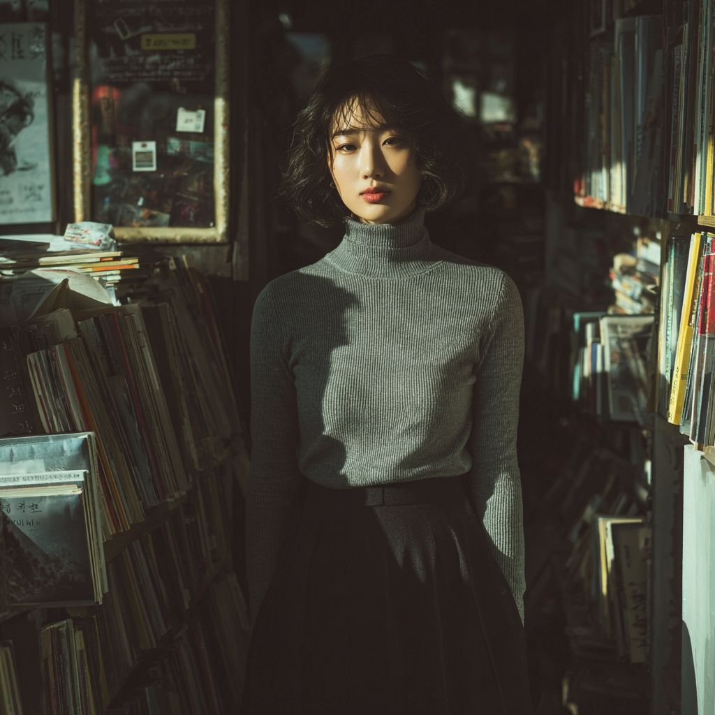 A Korean woman in a small vintage bookstore, wearing a gray turtleneck and black midi skirt, with a calm expression, cinematic light and shadow.