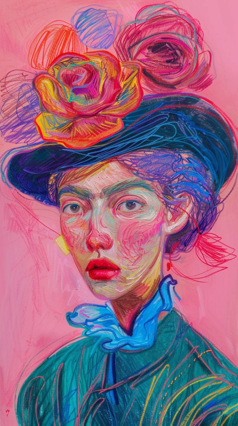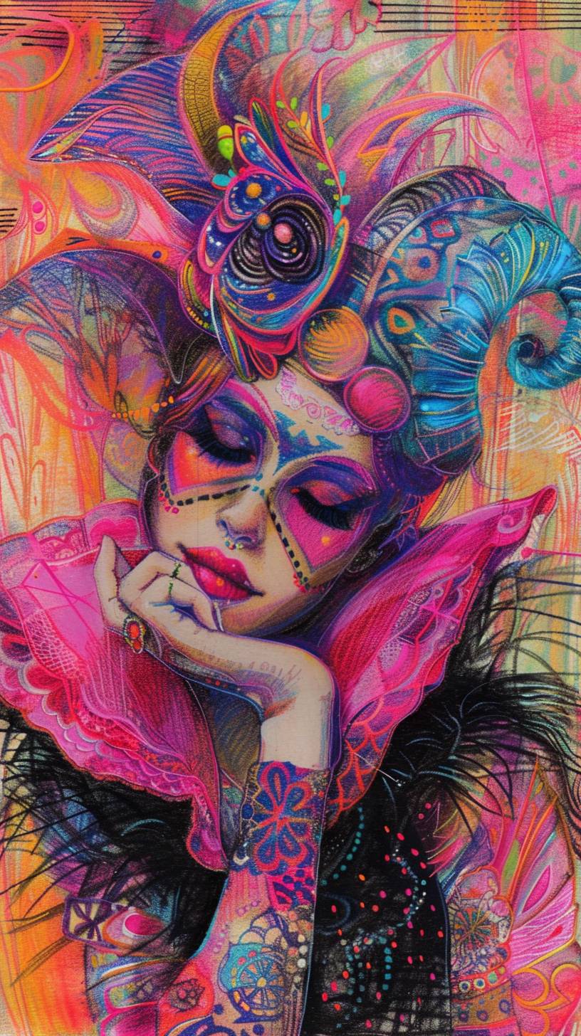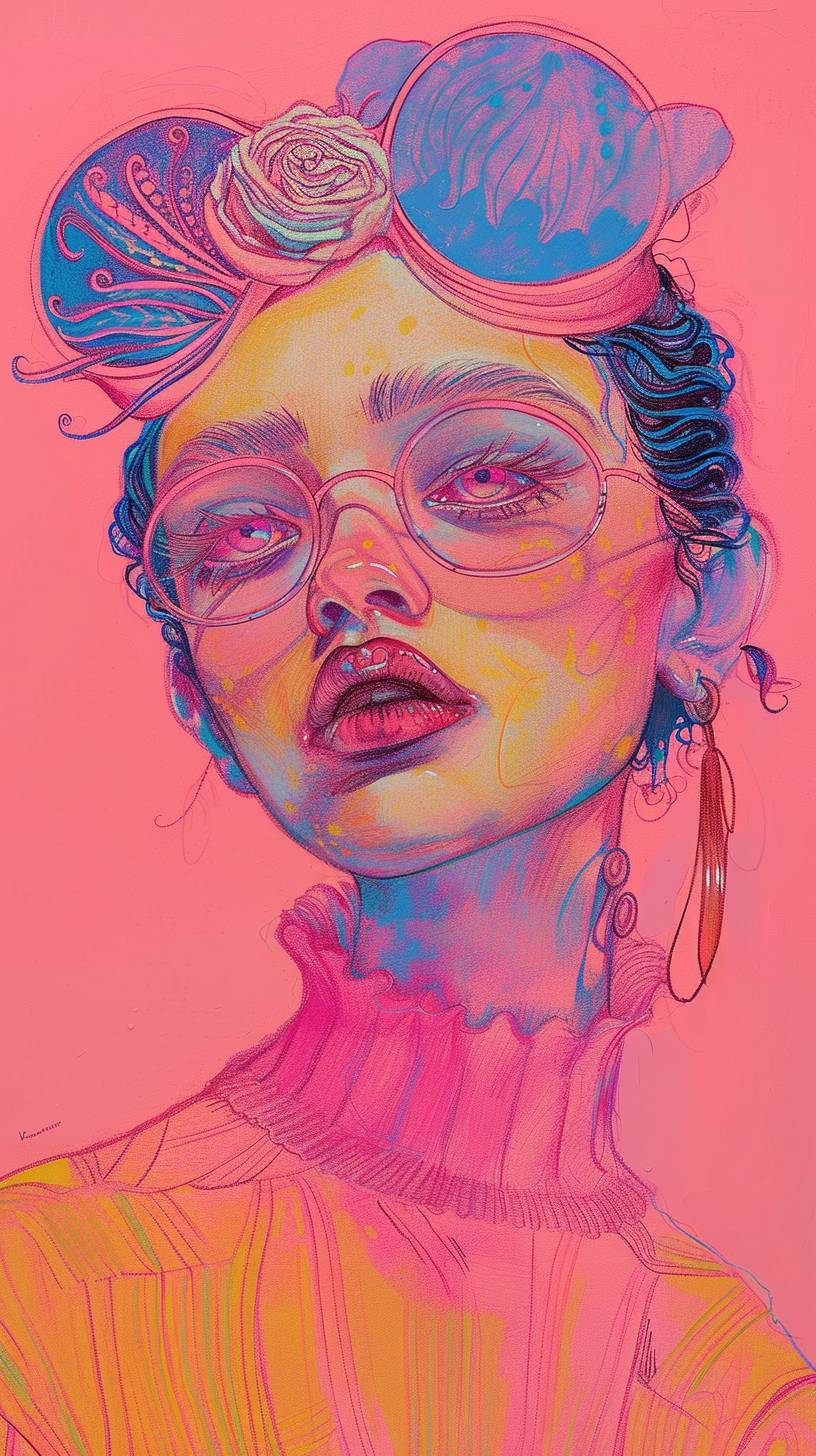 A woman depicted in the style of pink fantasy, vintage, pop surrealism with bright colors and pastel drawing.