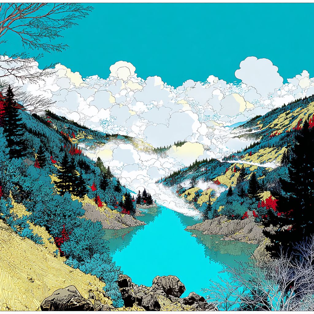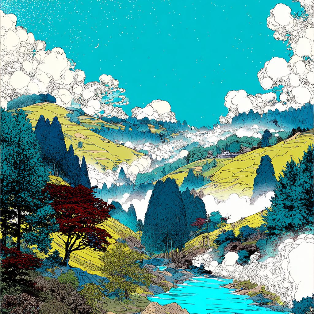 a serene valley mist --sref 2486422191 --ar 1:1 --v 7.0