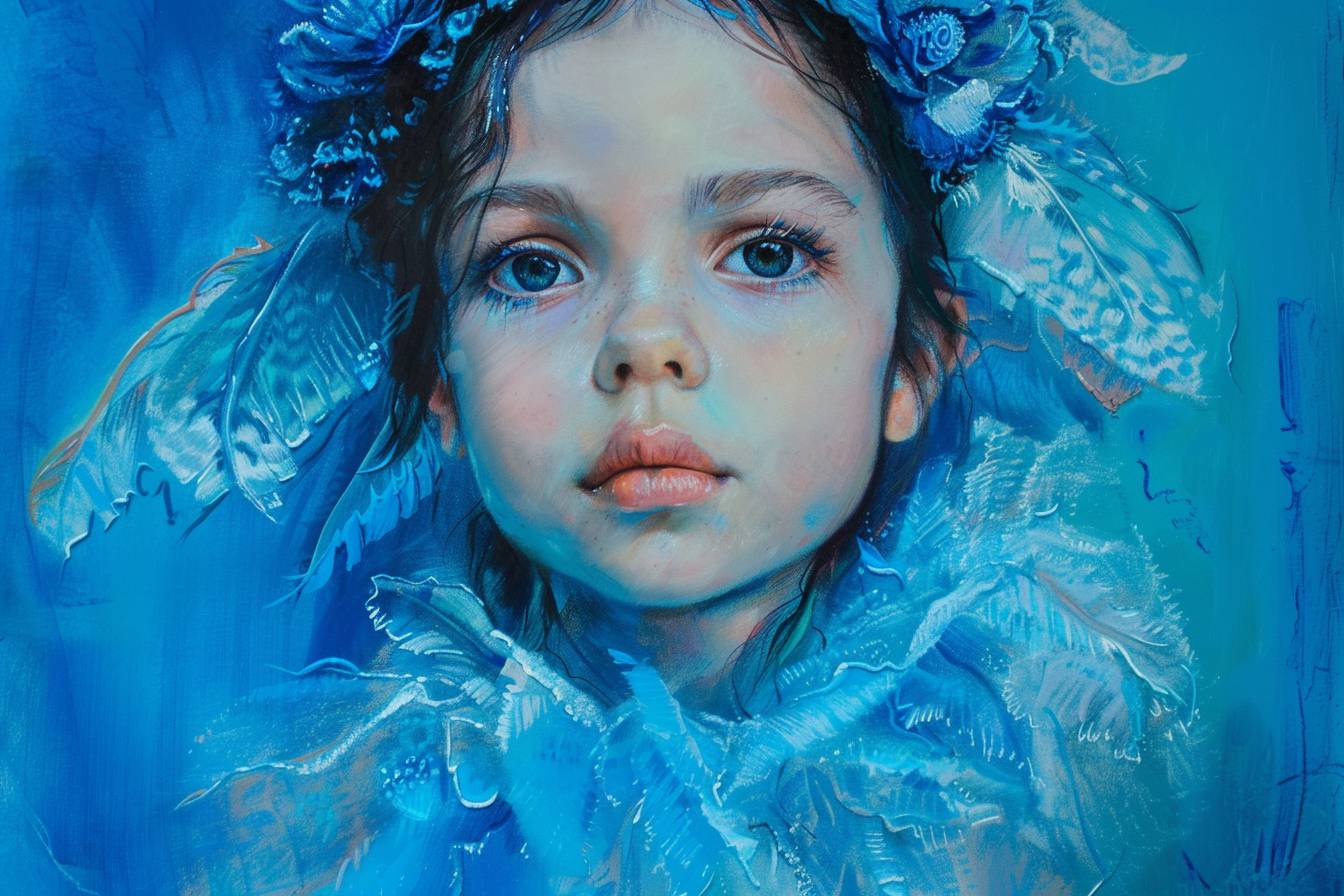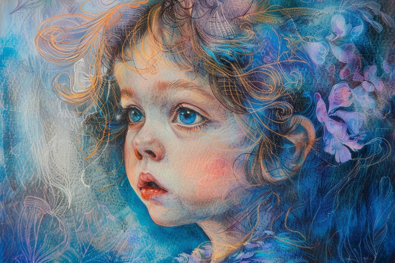 Child in the style of blue fantasy, vintage, pop surrealism, bright colors, pastel drawing.