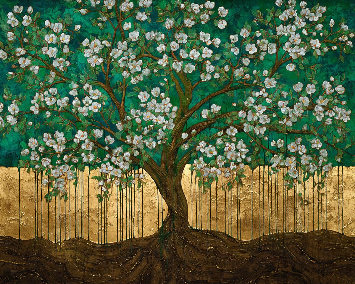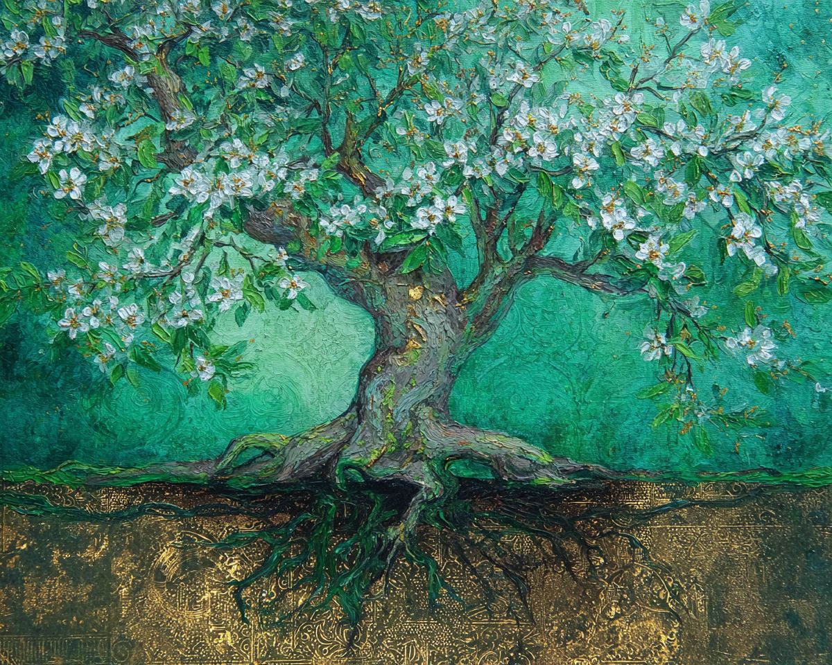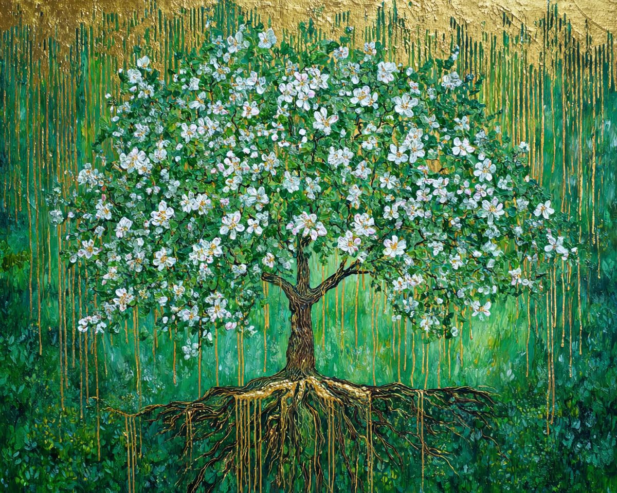 Dream art, tenderness, a large green tender tree with powerful branches, incredibly beautiful apple tree flowers, Russian Slavic painting of a white carpet ornament, the roots of the tree penetrate the soil, a river of Russian power flows inside the tree trunk, painting, textured strokes, canvas texture, delicate drips of gold leaf.