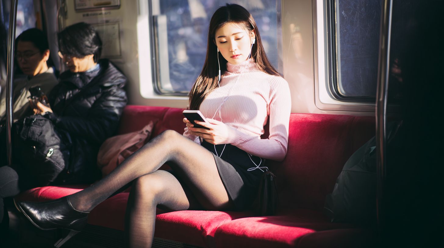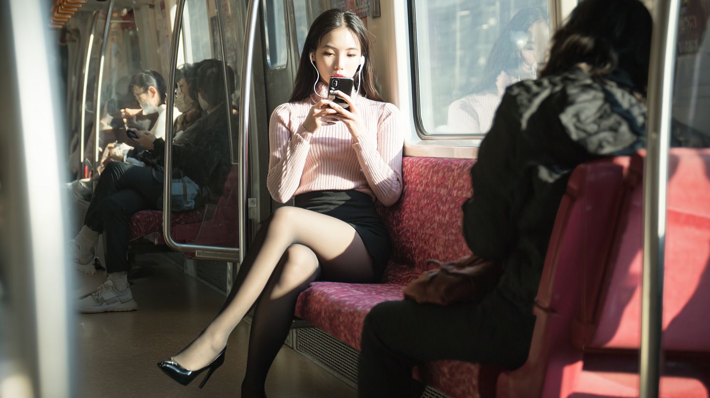 A Korean woman sits on a red plastic seat in the morning subway wearing a pink turtleneck and black skirt while using her smartphone
