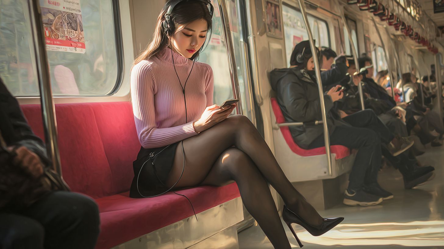 : A hyper-realistic DSLR photo of a gorgeous korean woman commuting on a morning subway, sitting on a red plastic seat with one leg crossed. She is facing the camera while using her smartphone with both hands and wearing earphones on her head. She wears a fitted pastel pink ribbed turtleneck top, a black skirt, sheer black tights, and glossy black high heels. Her sleek dark hair is down, and sunlight streams in from the subway window, highlighting the realistic texture of her skin, tights, and clothes. Commuters sit nearby, slightly out of focus, while she remains sharply detailed and prominently featured. The skin texture is photorealistic, the lighting is cinematic and natural, and the facial features are sharp and expressive. The image has depth of field and crisp resolution, as if taken with a professional DSLR. --ar 16:9 --v 7.0 --s 50