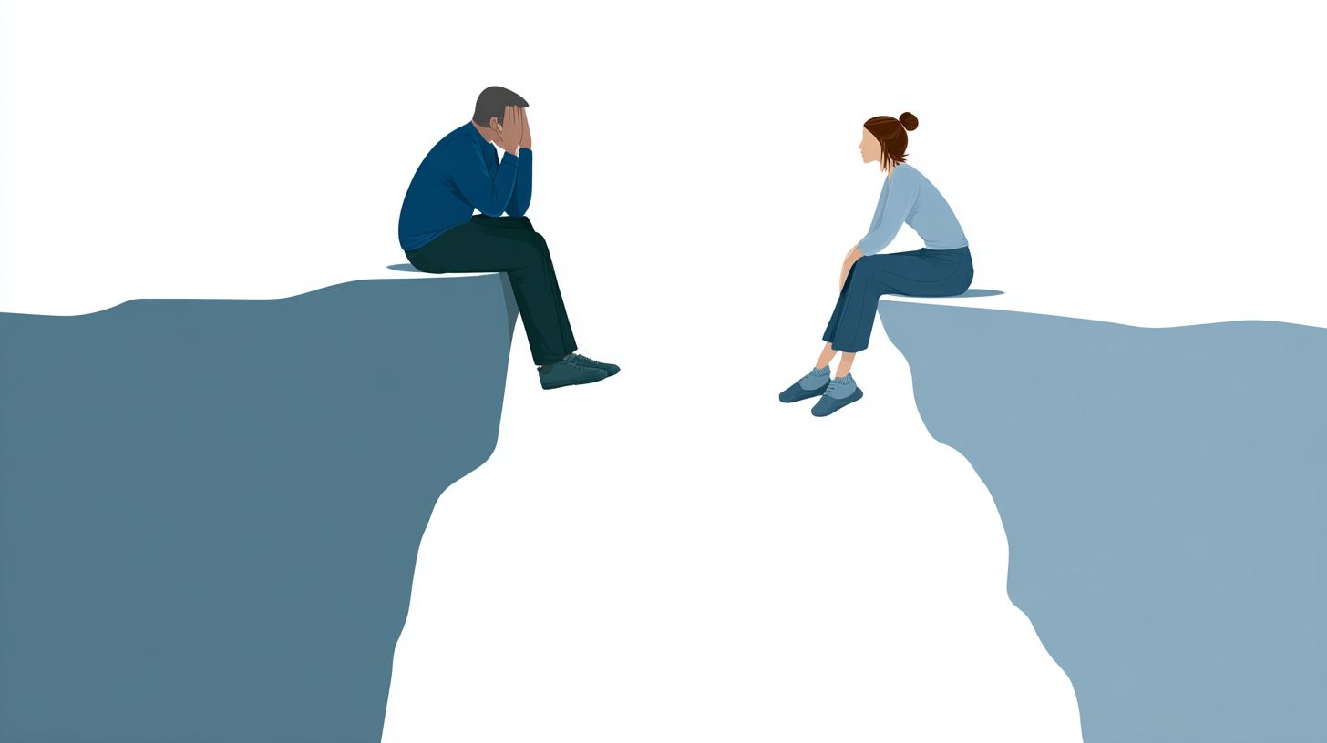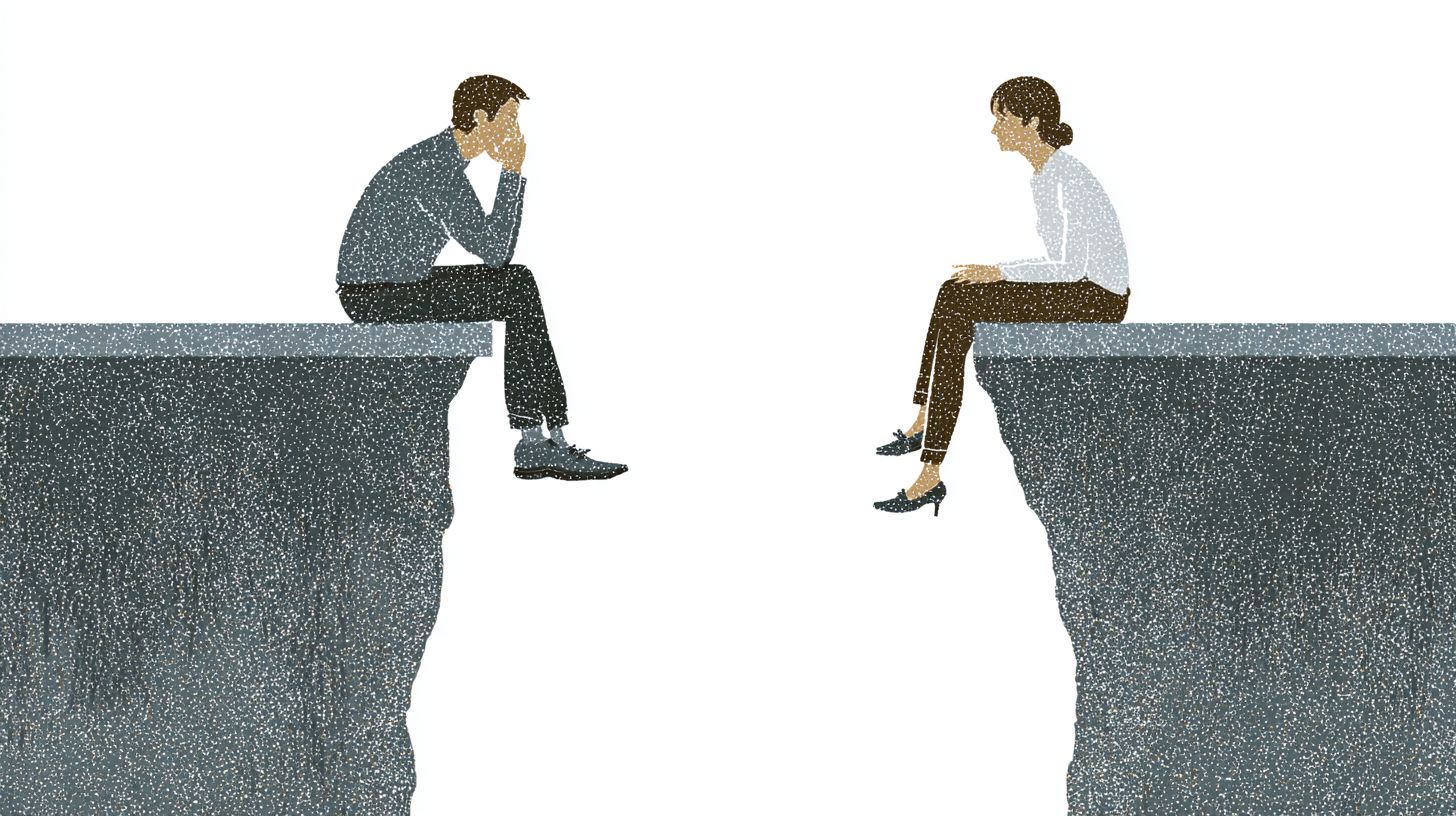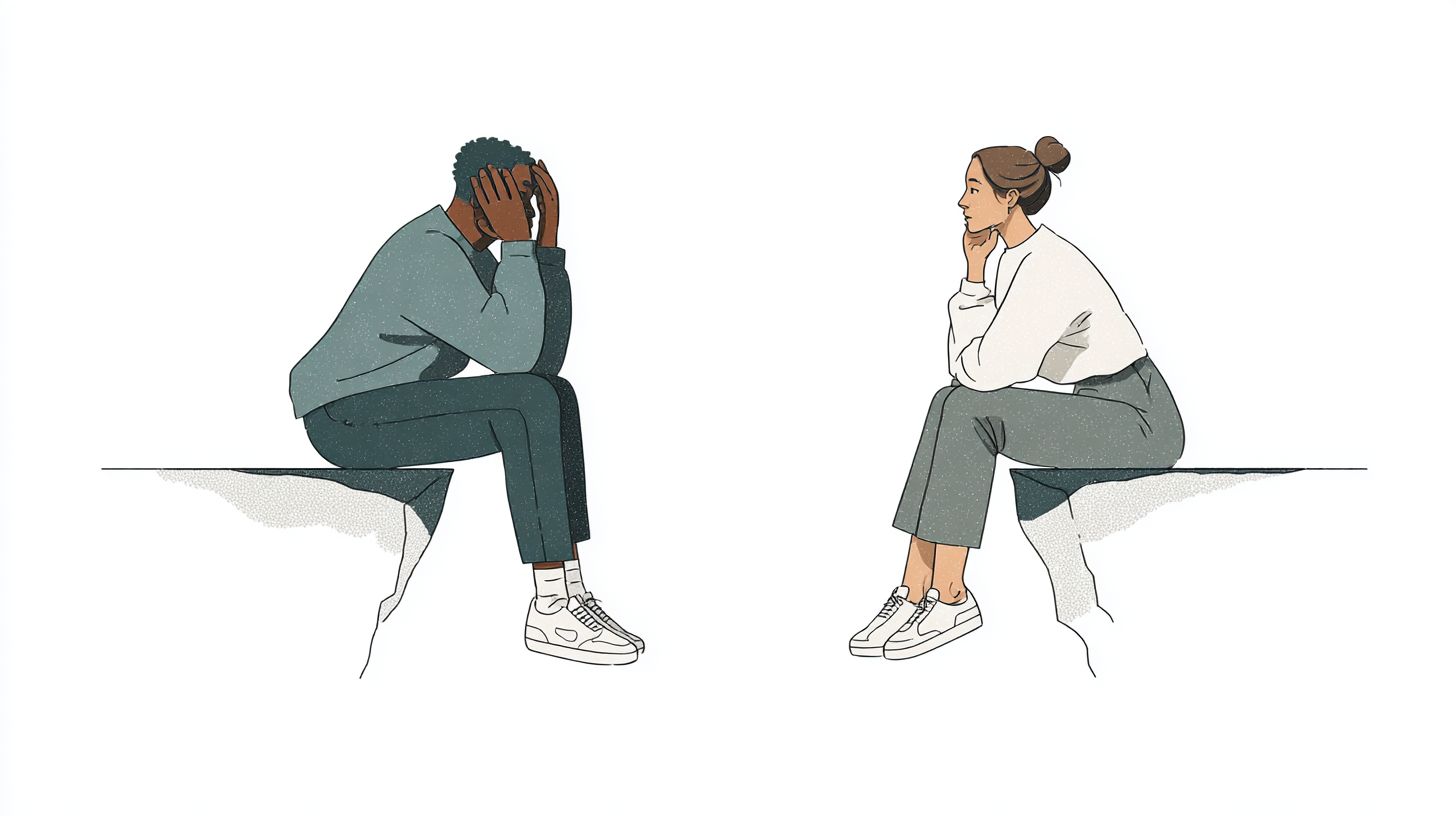 A man and woman sit on the edge of an abyss looking like they are about to slip off, facing each other across it. The illustration is in a flat professional design style with no shadows or gradients and has a white background. It features two people wearing casual attire. He is wearing trainers and is in his 40s. His hands are on his head. Their feet dangle over the space below them, adding to their isolation from the ground above. In the style of John Holcroft for A24.