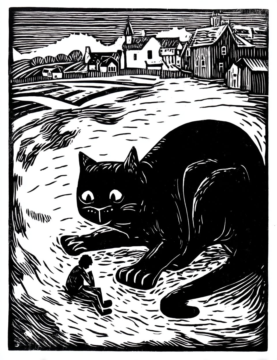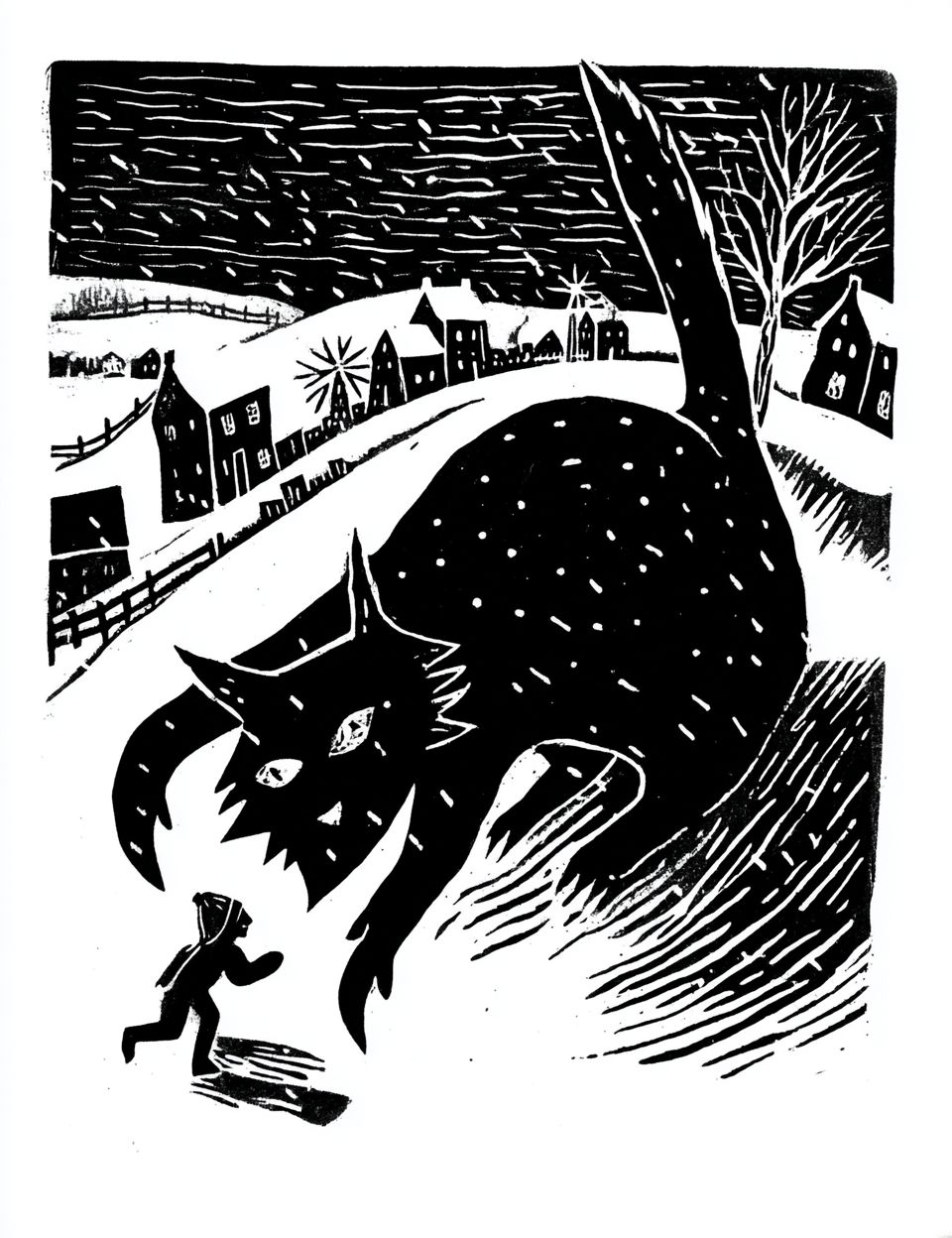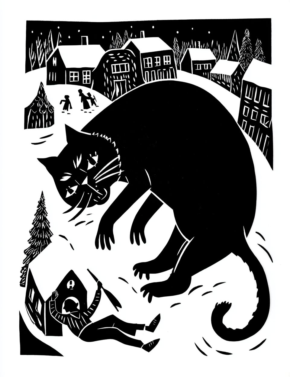 linocut print of giant yule cat attacking guy on ground, small villagein background. simple design, in the style of sarah andersen. --ar 55:71 --quality 2 --s 50 --v 7.0