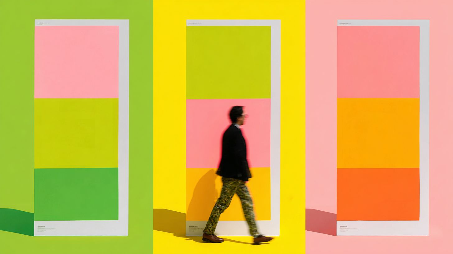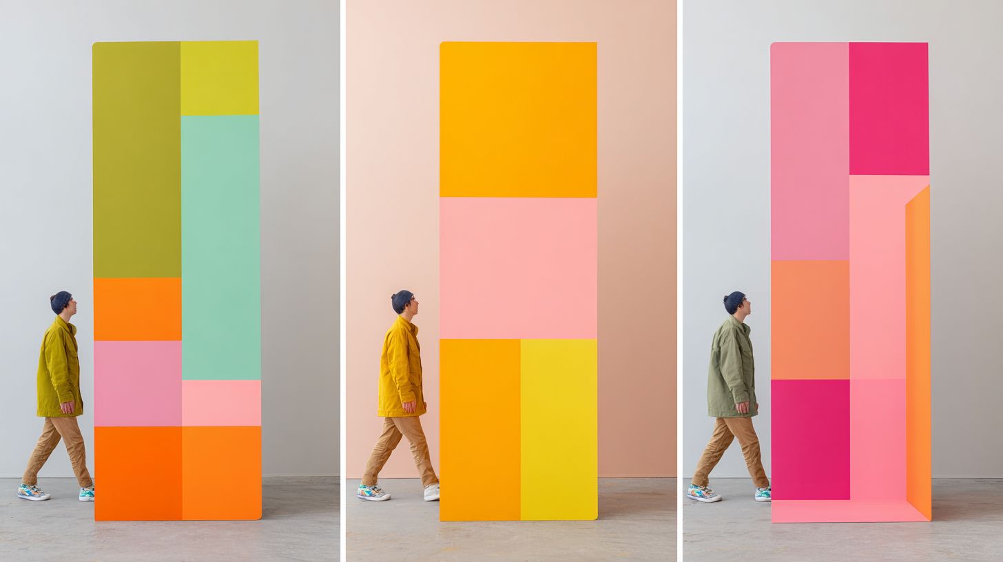 An art installation featuring three panels in green, pink, and orange accents, showcasing a minimalist and modern style