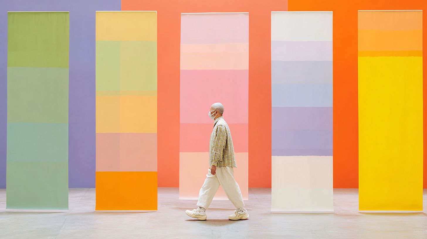 a set of three panels, each with a different color palette of green and pink with orange accents, designed in the style of nendo for an art installation made from woven fabric. the colors have no shading or gradients, and each panel is a vertical rectangle that stands on its own, covering part of one person who walks in front of it. as each person walks past multiple frames, the overall feel should be minimalist and modern --ar 16:9 --profile b7u4smn --s 50 --v 7.0