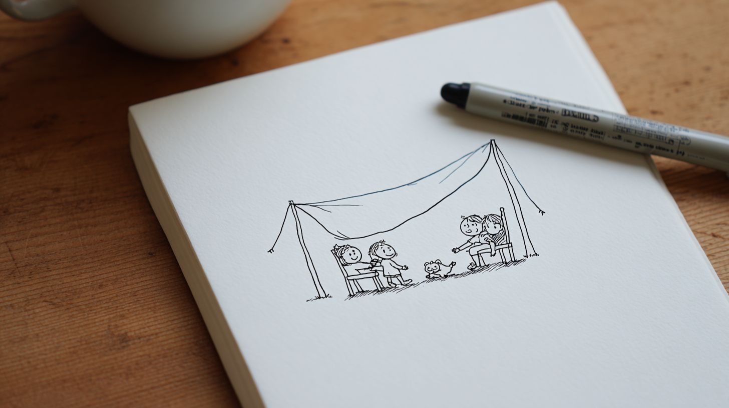 black line sketch on white paper, children playing under a blanket stretched between two chairs, forming a cozy little fort, minimalistic clean line art, hand-drawn style, playful and whimsical, no shading, sketchbook illustration --ar 16:9 --s 50 --v 7.0