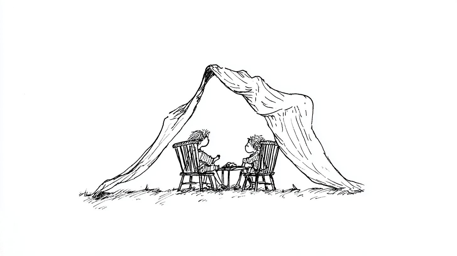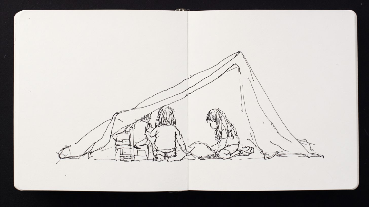 black line sketch on white paper, children playing under a blanket stretched between two chairs, forming a cozy little fort, minimalistic clean line art, hand-drawn style, playful and whimsical, no shading, sketchbook illustration
