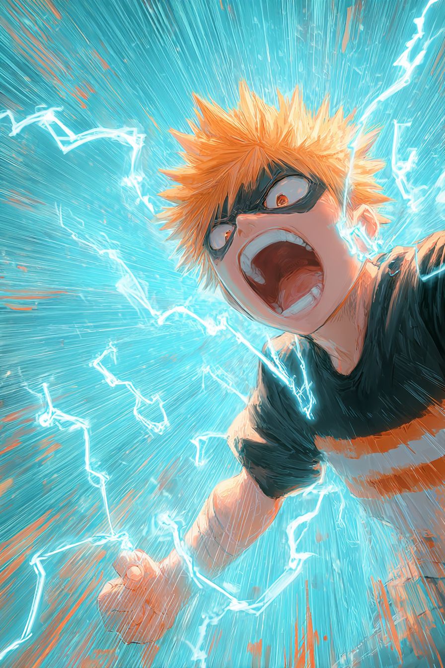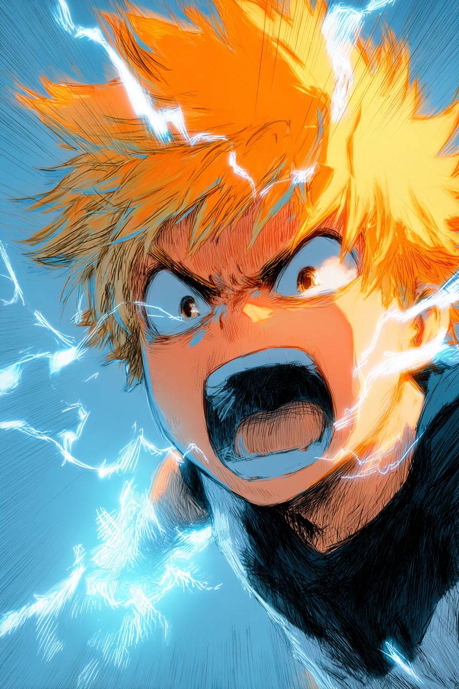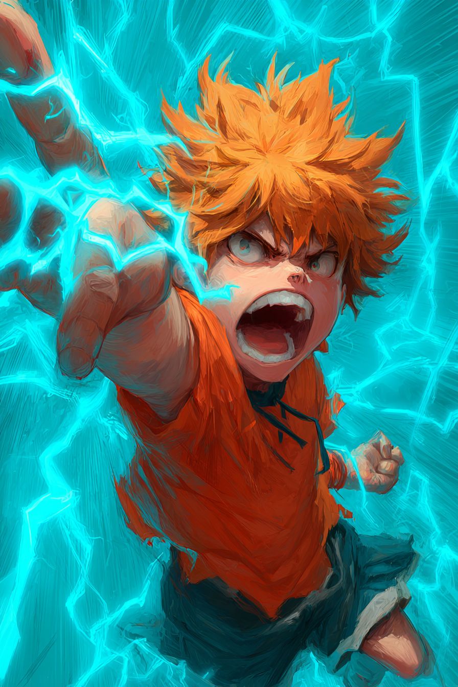 A young warrior with spiky orange hair powering up, shonen anime style, dynamic low-angle shot, crackling blue energy, speed lines, intense shouting expression, vibrant colors --ar 2:3 --v 7.0