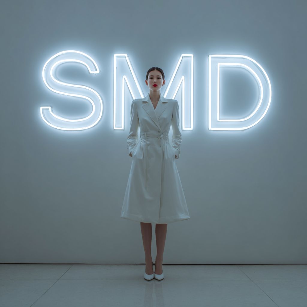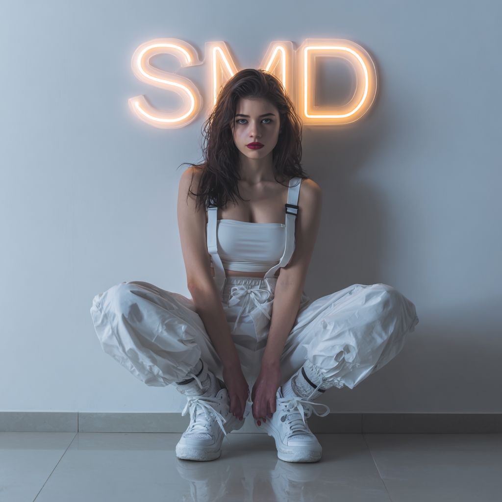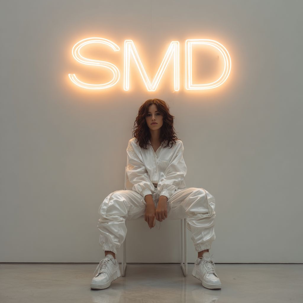 A female model in a professional photoshoot. A clean white wall with centered neon 'SMD' letters on the wall, resembling an advertisement.