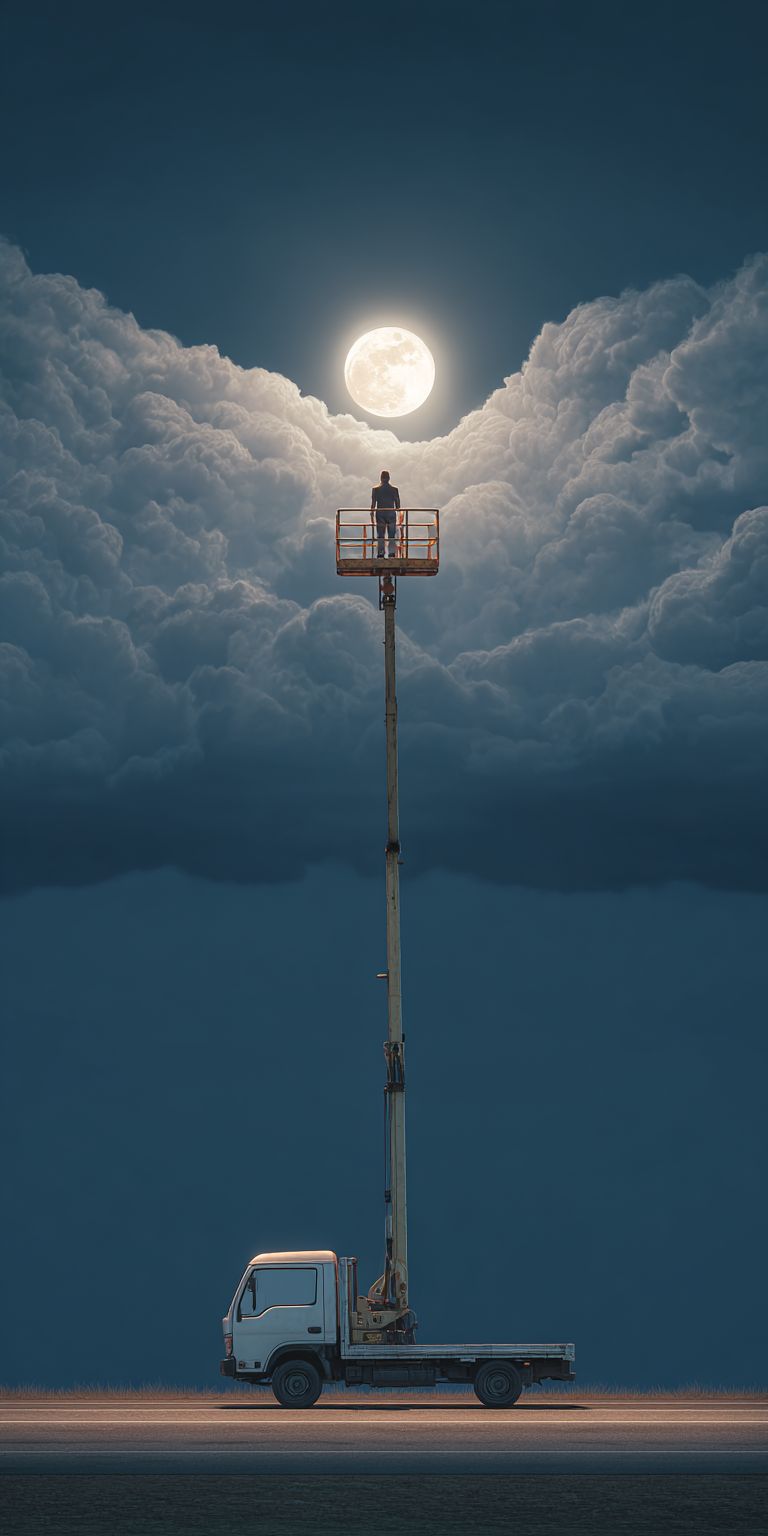 ultra-realistic photo of a small utility truck with a vertical aerial lift arm seen in side profile, parked on a rural French road with a single white dashed center line, authentic French countryside setting. The truck is at the bottom of the image. The lift arm fully extends straight up through a dense horizontal layer of clouds, which obscures the middle part of the arm. At the very top, the open lift basket emerges above the clouds, positioned next to a bright full moon in the dark night sky. A single person stands inside the basket at the top, gazing toward the moon. Strong, poetic visual contrast: sharp detail below (road, truck), soft dreamy clouds in center, moonlit sky above. No text, ultra-realistic, split composition, cinematic lighting, profile view, alone in nature --ar 1:2