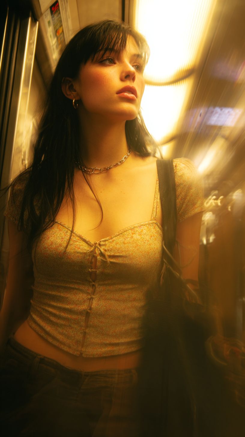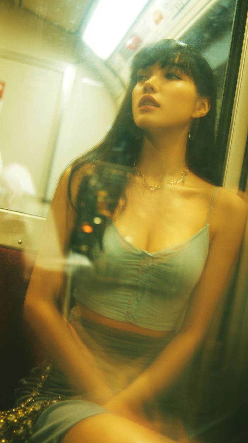 A spontaneous photo of a s-exy day-vibe woman on a subway train, long dark hair with straight bangs, fair complexion, wearing a cropped camisoles and mini skirt, gazing out the window dreamily, motion blur from the moving train, reflective glass adding depth. --ar 9:16
