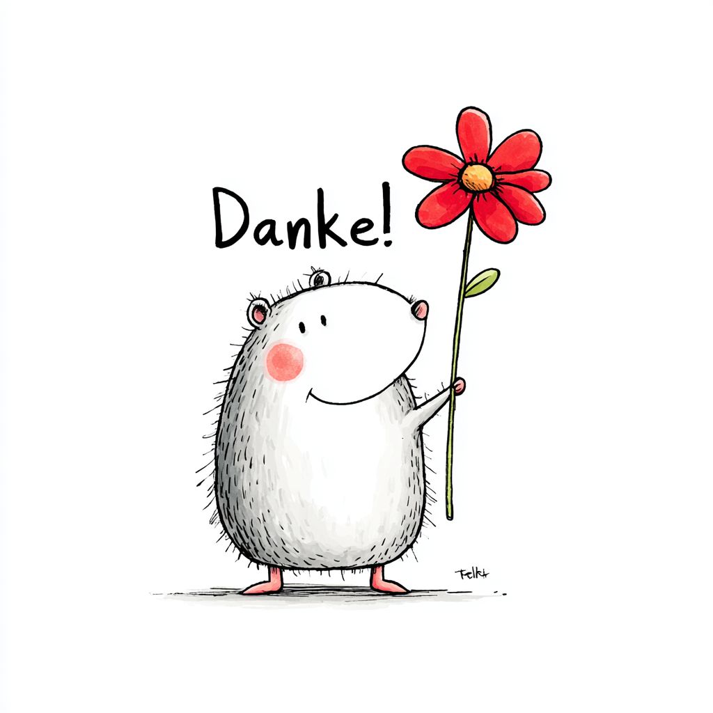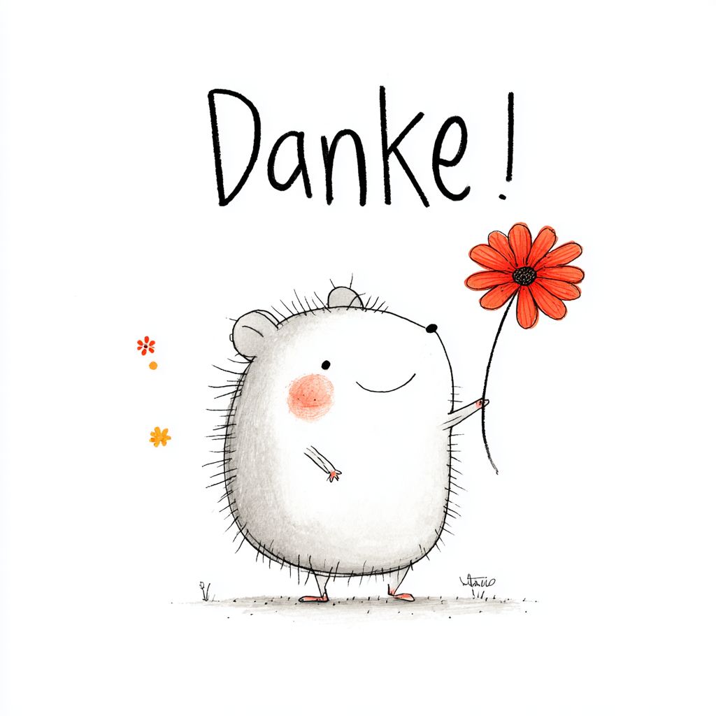 Large text: "Danke!" happy hamster holding a big flower, in the style of Liz Climo and Chris Johanson, white background --profile qyug7tl