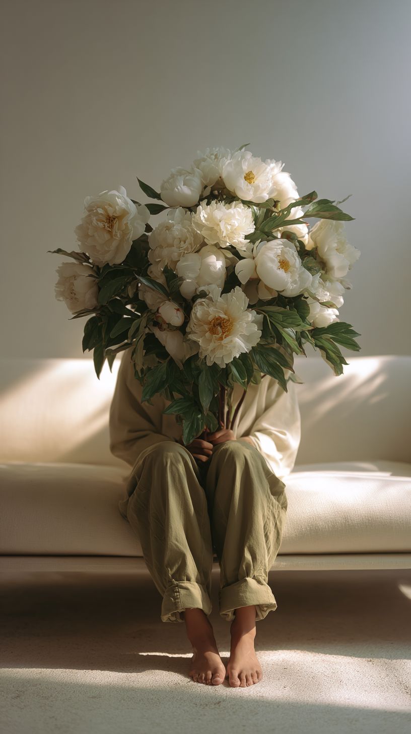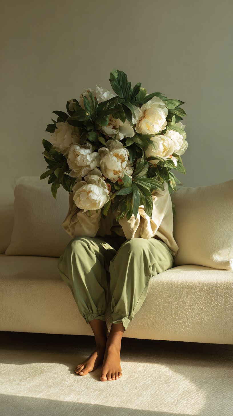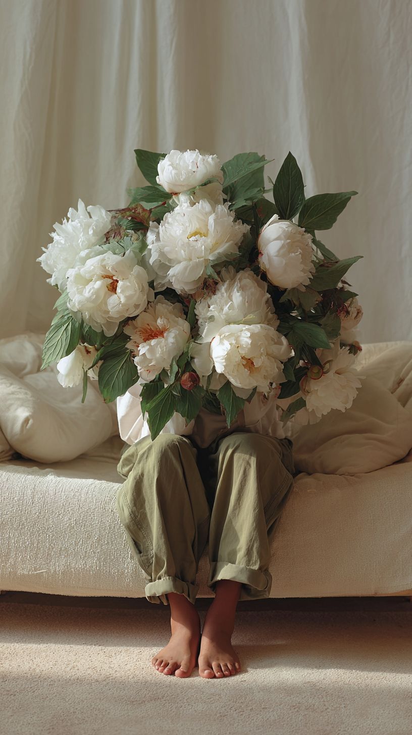 a photograph of the back of an oversized flower bouquet, sitting atop and covering the person's head with green leaves and white peonies. the person is wearing light olive-colored pants and is barefoot, sitting in front of a cream-colored sofa. the room has natural lighting, and the floor's surface color resembles that of fine sand. the style mimics hyper-realistic portraits in the style of artists inspired by zao wou-ki and picasso, creating a dreamy atmosphere --ar 9:16 --raw --v 7.0
