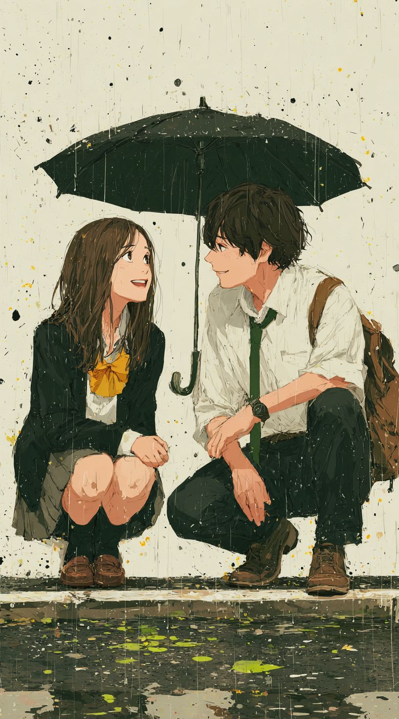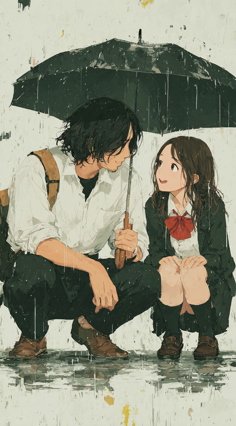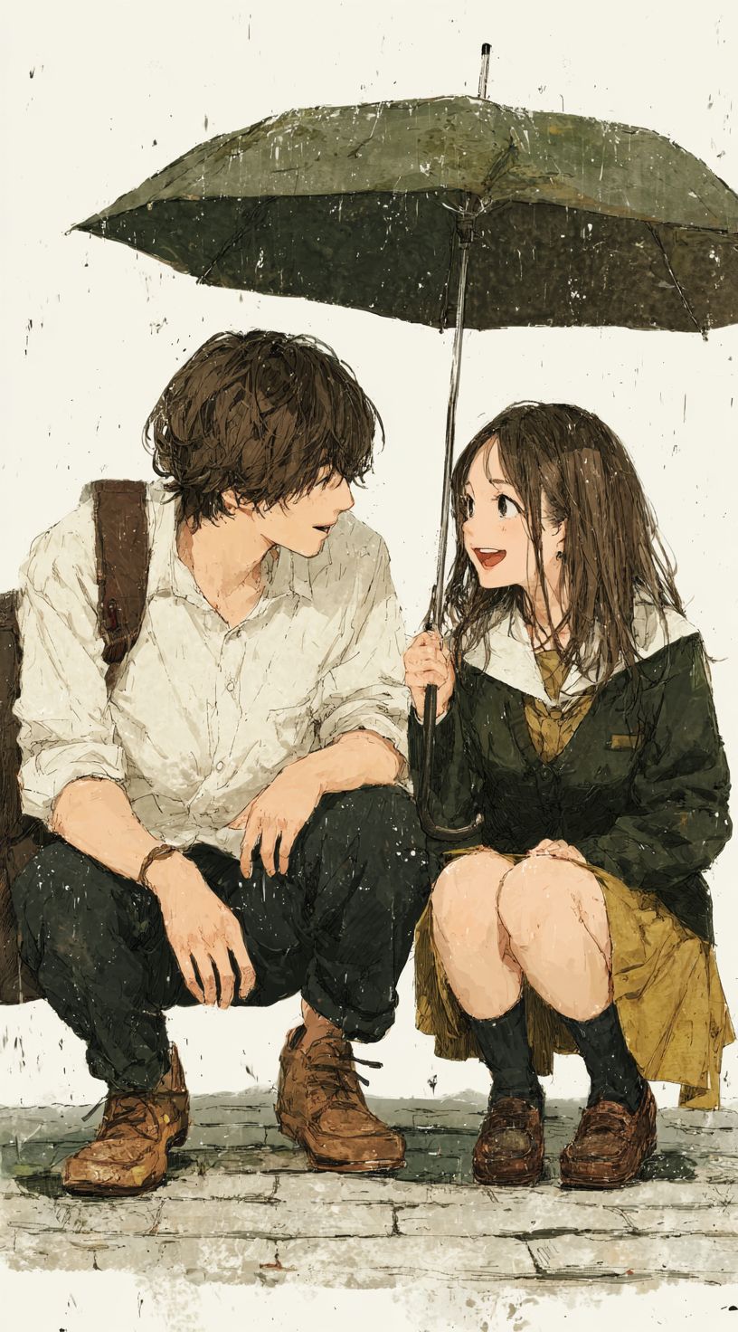 A boy in a white shirt and black pants is kneeling down holding an umbrella, while a long-haired girl with dark brown eyes in a school uniform stands next to him, looking at each other happily. Anime style, anime aesthetic, high resolution, full body shot, white background, anime aesthetic, light rain effect, cute, high detail, high quality, perfect details, high definition.