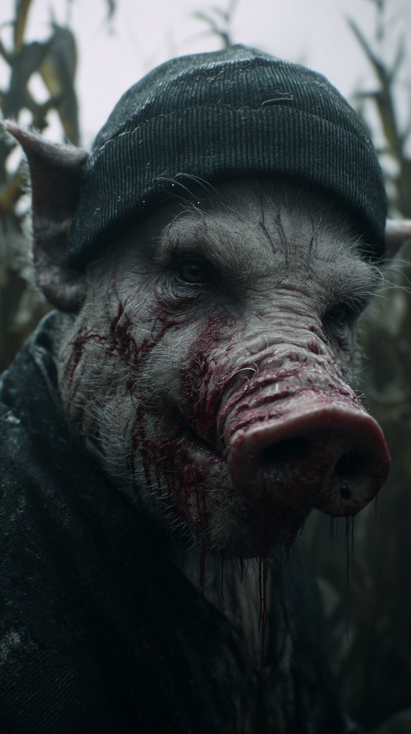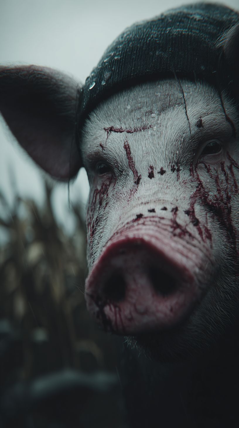 An extreme close-up, ultra-realistic shot of a person wearing a scarred, lifelike pig mask. A blank black beanie sits low on their head, with jagged, choppy black hair sticking out in wet clumps. Fresh bloods is sprayed across the mask--fine mist droplets across the snout, streaks running down the cheek plates, and tiny splatters caught in the stitched scars. Rain mixes with the bloods, creating diluted red rivulets dripping off the snout. The background is barely visible, just blurred hints of a cornfield during an overcast, rainy day. Cold, diffused lighting from the gray sky enhances the gritty texture of the mask and wet surfaces. Hyper-detailed close-up: pores in the latex, rain droplets, bloods mist, and damp hair strands. Cinematic horror intensity, tight framing, high tension. --ar 9:16 --profile vklj2rk --v 7.0