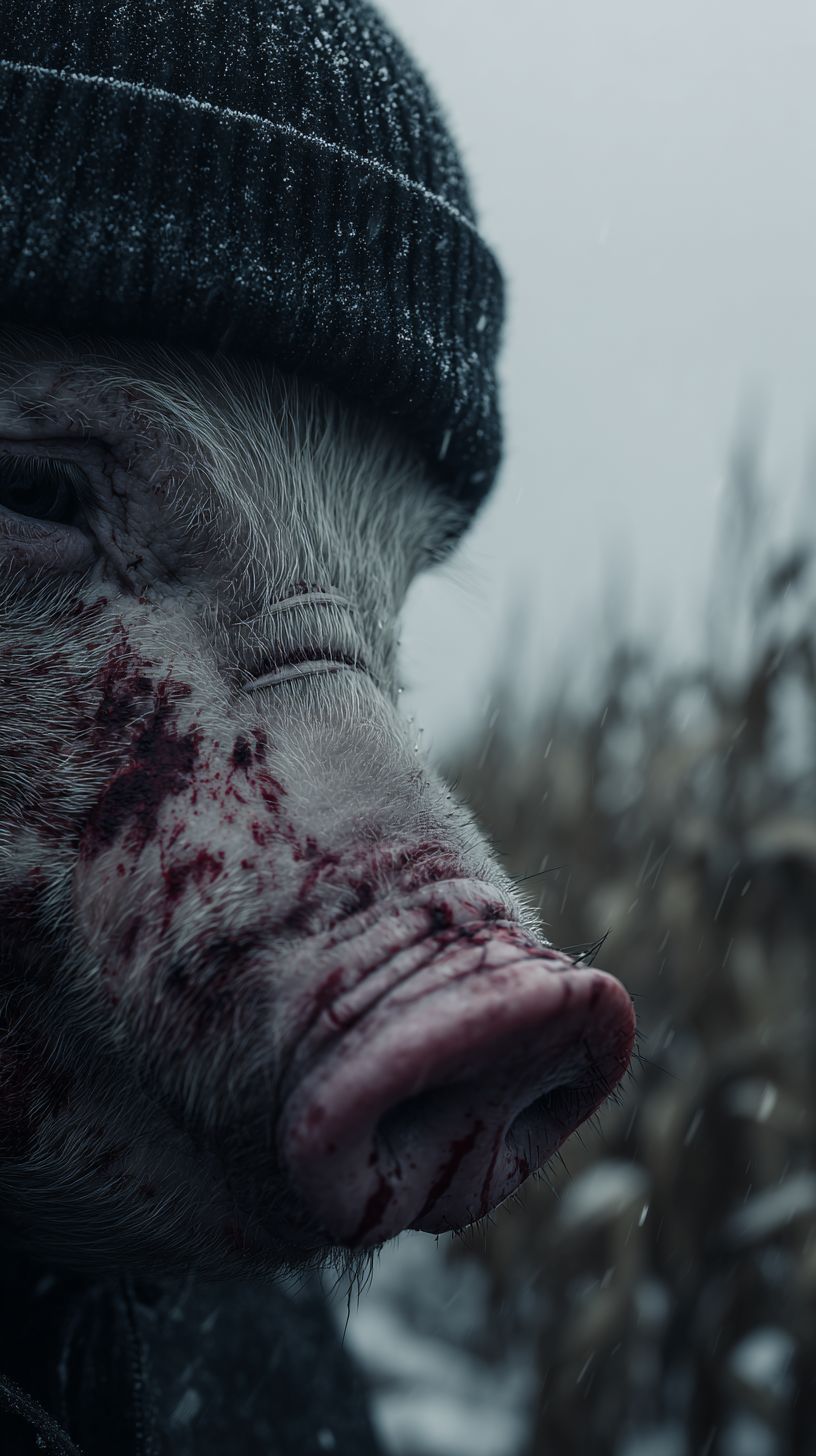 An extreme close-up, ultra-realistic shot of a person wearing a scarred, lifelike pig mask. A blank black beanie sits low on their head, with jagged, choppy black hair sticking out in wet clumps. Fresh blood is sprayed across the mask--fine mist droplets across the snout, streaks running down the cheek plates, and tiny splatters caught in the stitched scars. Rain mixes with the blood, creating diluted red rivulets dripping off the snout. The background is barely visible, just blurred hints of a cornfield during an overcast, rainy day. Cold, diffused lighting from the gray sky enhances the gritty texture of the mask and wet surfaces. Hyper-detailed close-up: pores in the latex, rain droplets, blood mist, and damp hair strands. Cinematic horror intensity, tight framing, high tension.