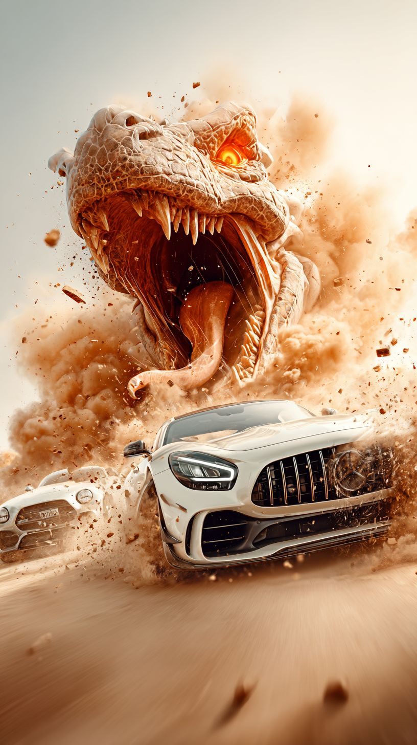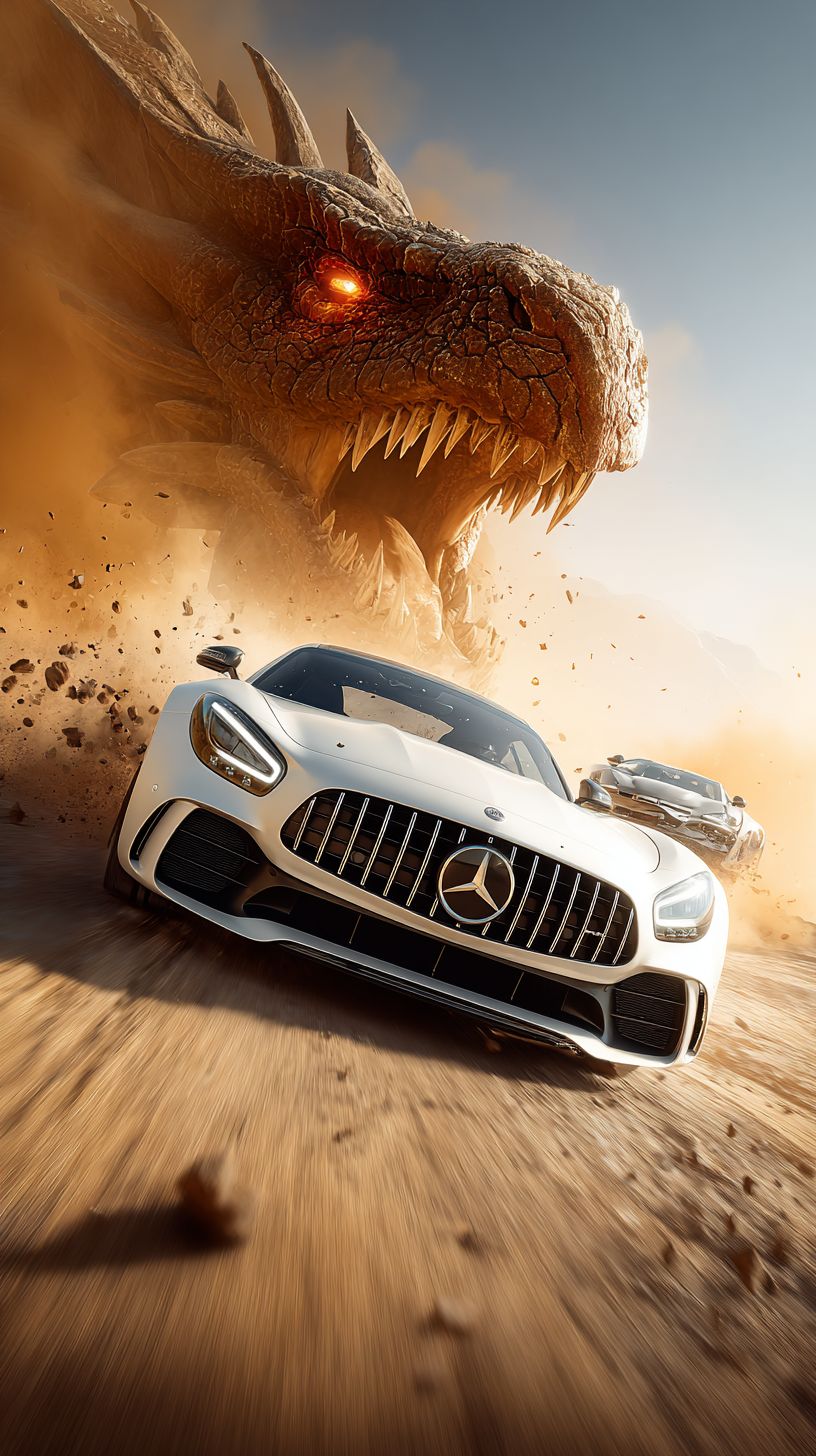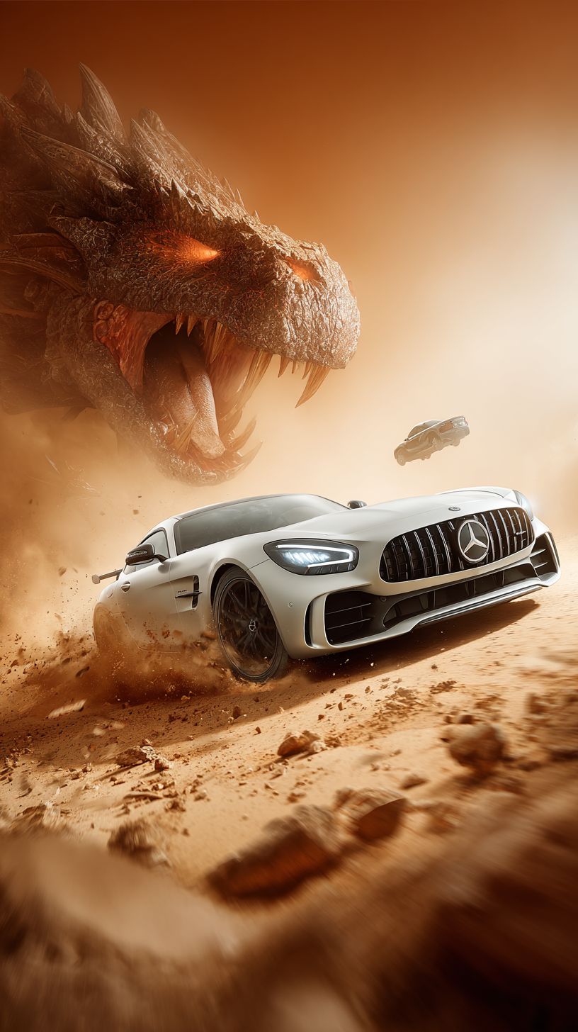 Ultra-cinematic action scene of a white Mercedes-Benz AMG sports car racing at high speed on a destroyed dirt road, extreme low-angle shot, dynamic motion blur, debris flying toward the camera. A massive dragon with glowing red eyes and an open roaring mouth emerges from a swirling orange dust storm in the background. Dramatic apocalyptic lighting, harsh warm tones, destructive atmosphere, depth of field focused on the car, background slightly blurred. A second car following behind in the dust trail. Hyper-realistic textures, volumetric lighting, cinematic color grading, 8K, high detail, sharp foreground, epic blockbuster style --chaos 20 --ar 9:16 --raw --profile 7jzgnxr h42uu4q --stylize 50 --v 7.0