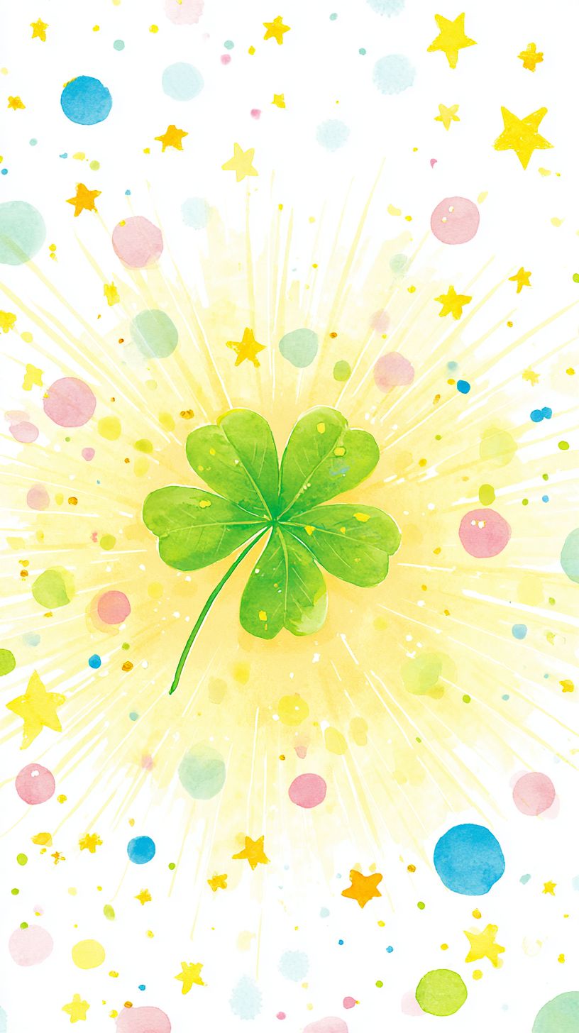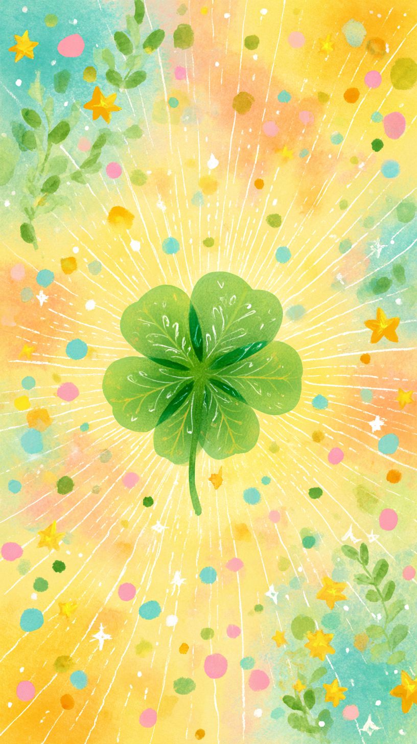 A cheerful children’s book illustration filled with bright lime-green and yellow hues. At the center, a cute little four-leaf clover glows like a tiny magical friend, surrounded by soft, hand-drawn sunbursts that stretch outward like warm sunshine. Sparkly stars twinkle around it, and colorful confetti dots--pink, blue, yellow--float gently in the air. The entire scene looks painted with crayons and soft pastels, playful and gentle, with a warm storybook charm. The atmosphere feels hopeful, lucky, and full of wonder, as if the clover is about to grant a wish, ultra hd, --ar 9:16 --v 7.0