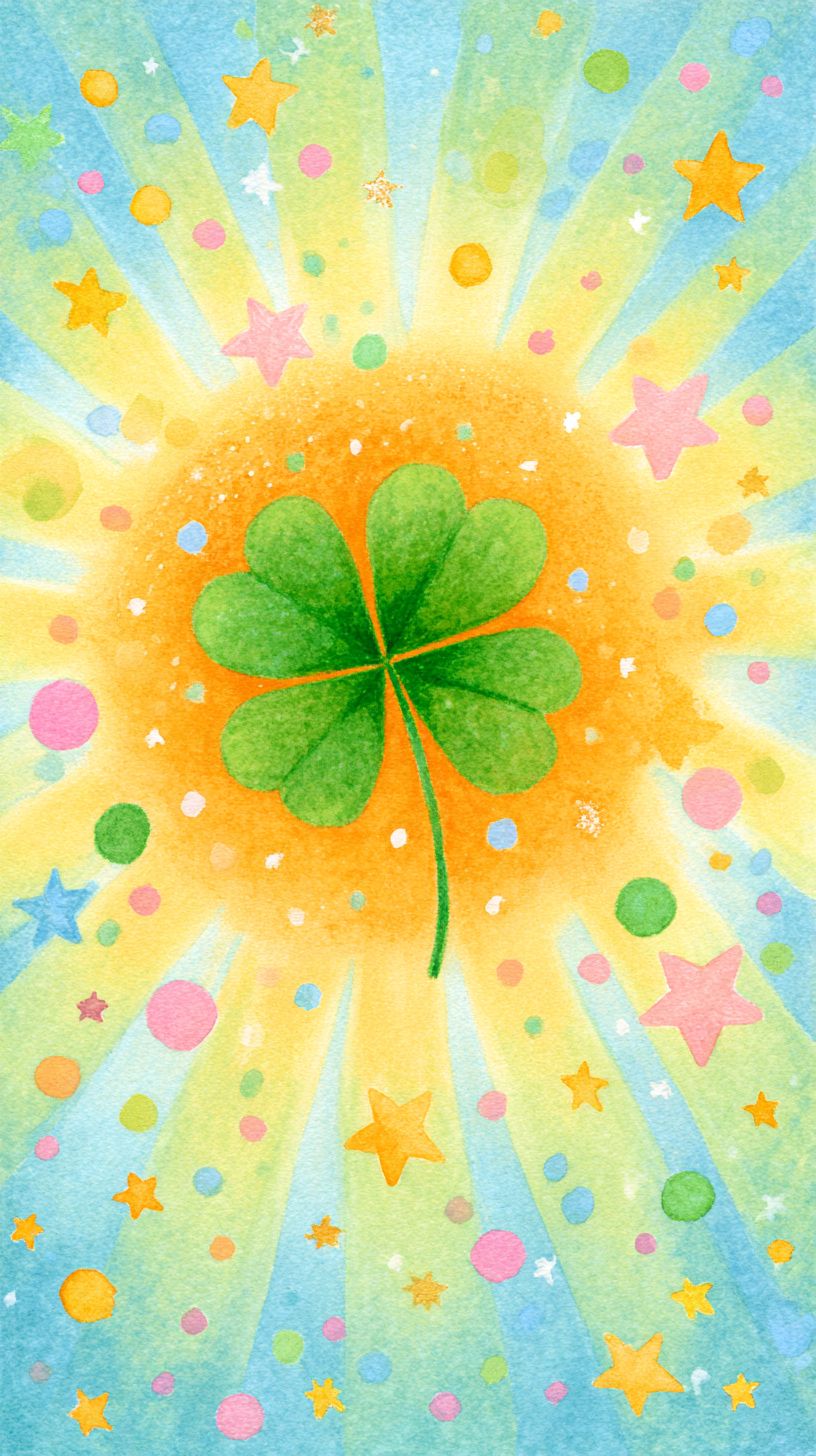 A cheerful children’s book illustration filled with bright lime-green and yellow hues. At the center, a cute little four-leaf clover glows like a tiny magical friend, surrounded by soft, hand-drawn sunbursts that stretch outward like warm sunshine. Sparkly stars twinkle around it, and colorful confetti dots—pink, blue, yellow—float gently in the air. The entire scene looks painted with crayons and soft pastels, playful and gentle, with a warm storybook charm. The atmosphere feels hopeful, lucky, and full of wonder, as if the clover is about to grant a wish.