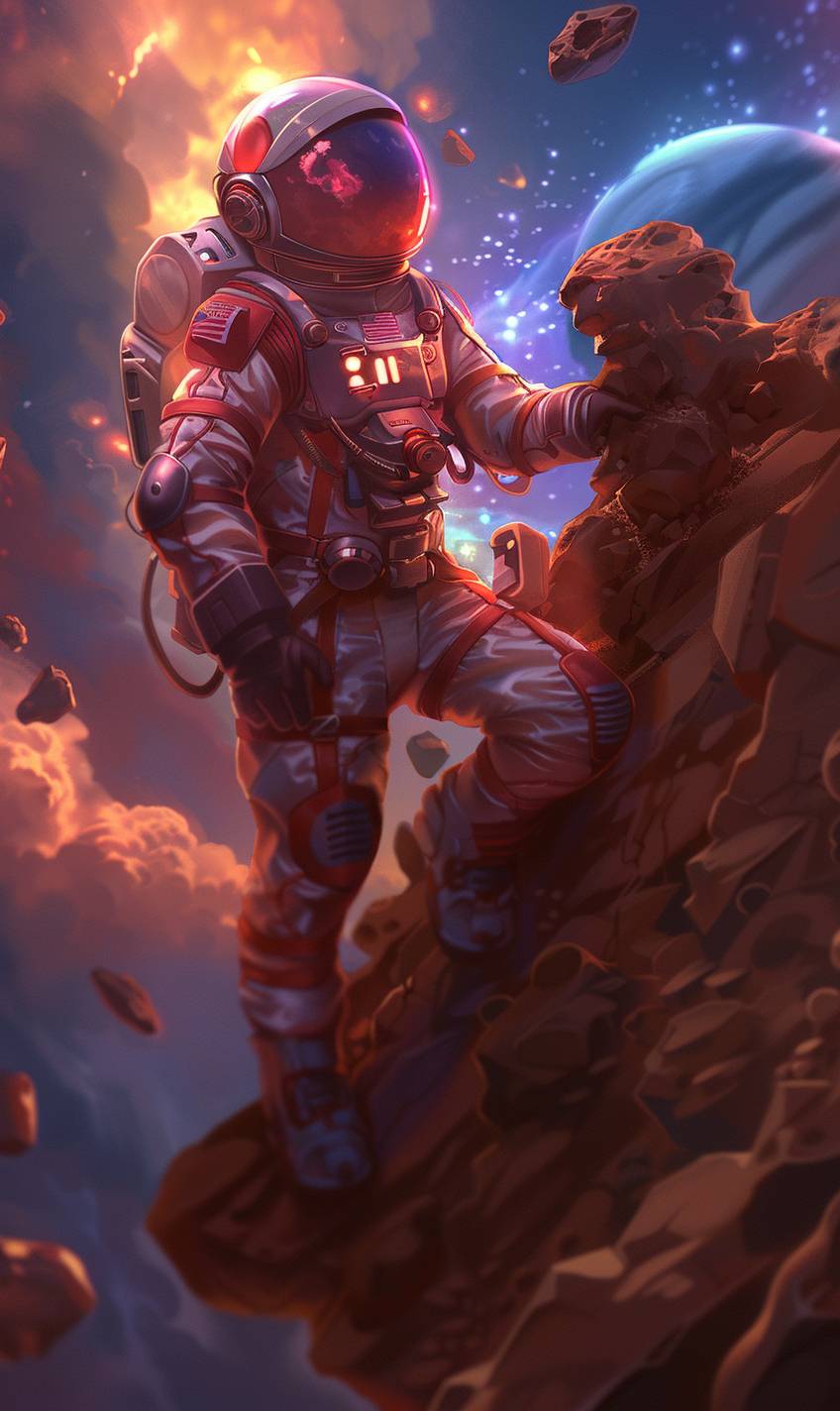 Astronaut exploring a distant planet, alien landscape with strange rock formations, a distant galaxy visible in the sky, high-tech suit --ar 3:5 --sref 3016754545 --v 6.0