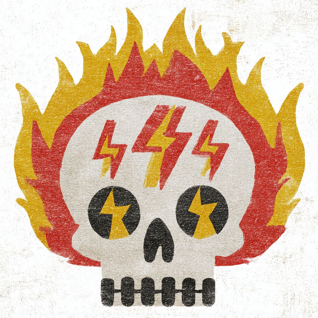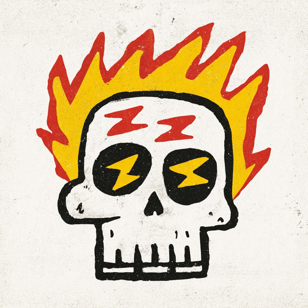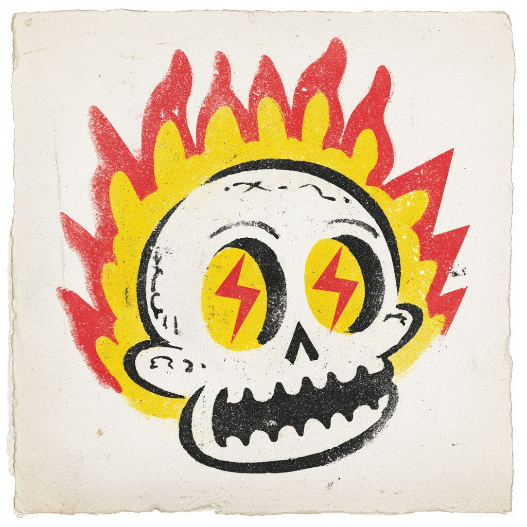 @20251116_026 The design features vintage distressed textures, bold, flat shapes, and clean lines. This image depicts a stylized cartoon skull with a white face. The skull's eye sockets are filled with bright yellow flames, and within these flames, there are red zigzag lines that resemble heartbeats or electrical signals. The flames are outlined in black, adding a bold contrast to the yellow and red colors. The overall design is simple yet striking, with the flames giving the skull a fiery and intense appearance. The background is plain white, which makes the skull and its fiery eyes stand out prominently. Hand-painted linoleum or woodcut textures, high contrast, vintage textures, and a minimalist style. --v 7.0