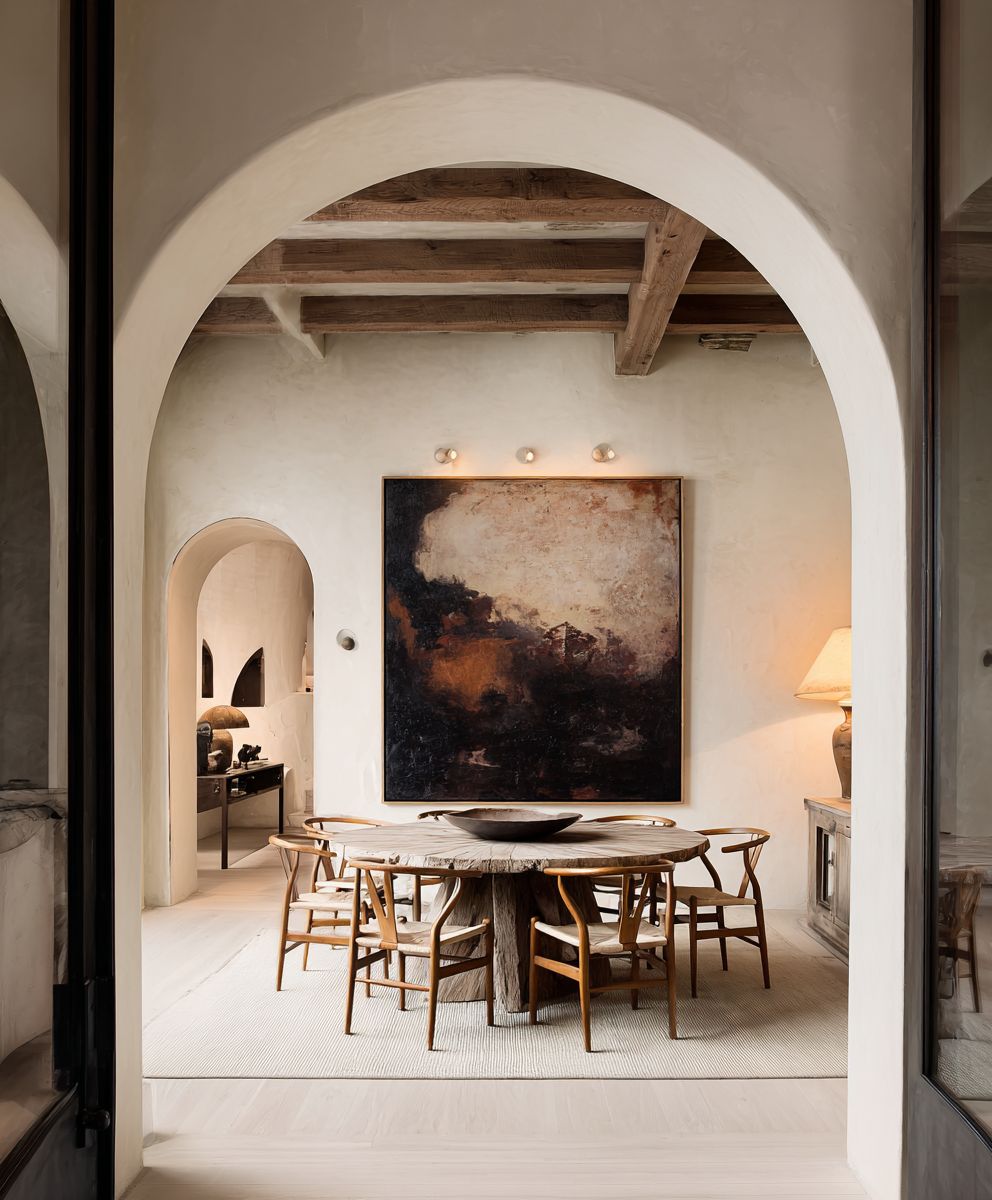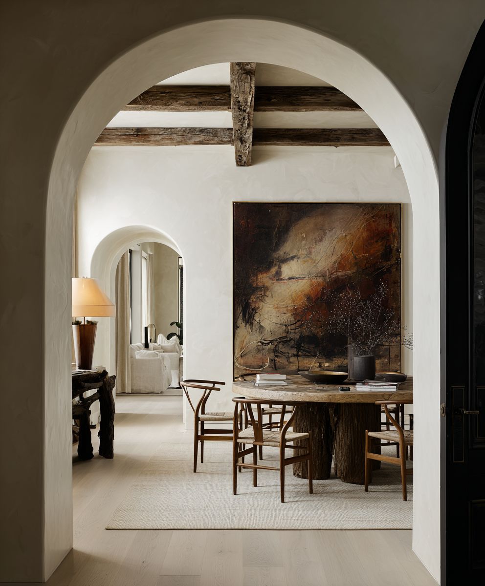 A sophisticated and luxurious wabi-sabi inspired dining room, viewed through a dark, elegant arched entryway. The room features a dramatic, oversized abstract painting on the far wall, with rich, textured dark brown and black tones blending into subtle hints of rust or amber, creating a profound, moody atmosphere. Below the artwork, a grand, organic-shaped round dining table made from raw, thick-cut wood with visible grain and imperfections is the centerpiece. It is surrounded by classic Wishbone chairs with woven seats, adding a touch of Scandinavian modernism. The ceiling has exposed beams, and the walls are a soft, off-white. To the left, a partially visible arched doorway leads to another room with a white door. The lighting is soft and diffused, with a warm table lamp on a side console. The floor is covered by a light-colored, textured rug over light wood, emphasizing natural materials and a serene, minimalist aesthetic with dramatic contrast. --ar 5:6 --raw --stylize 50 --v 7.0