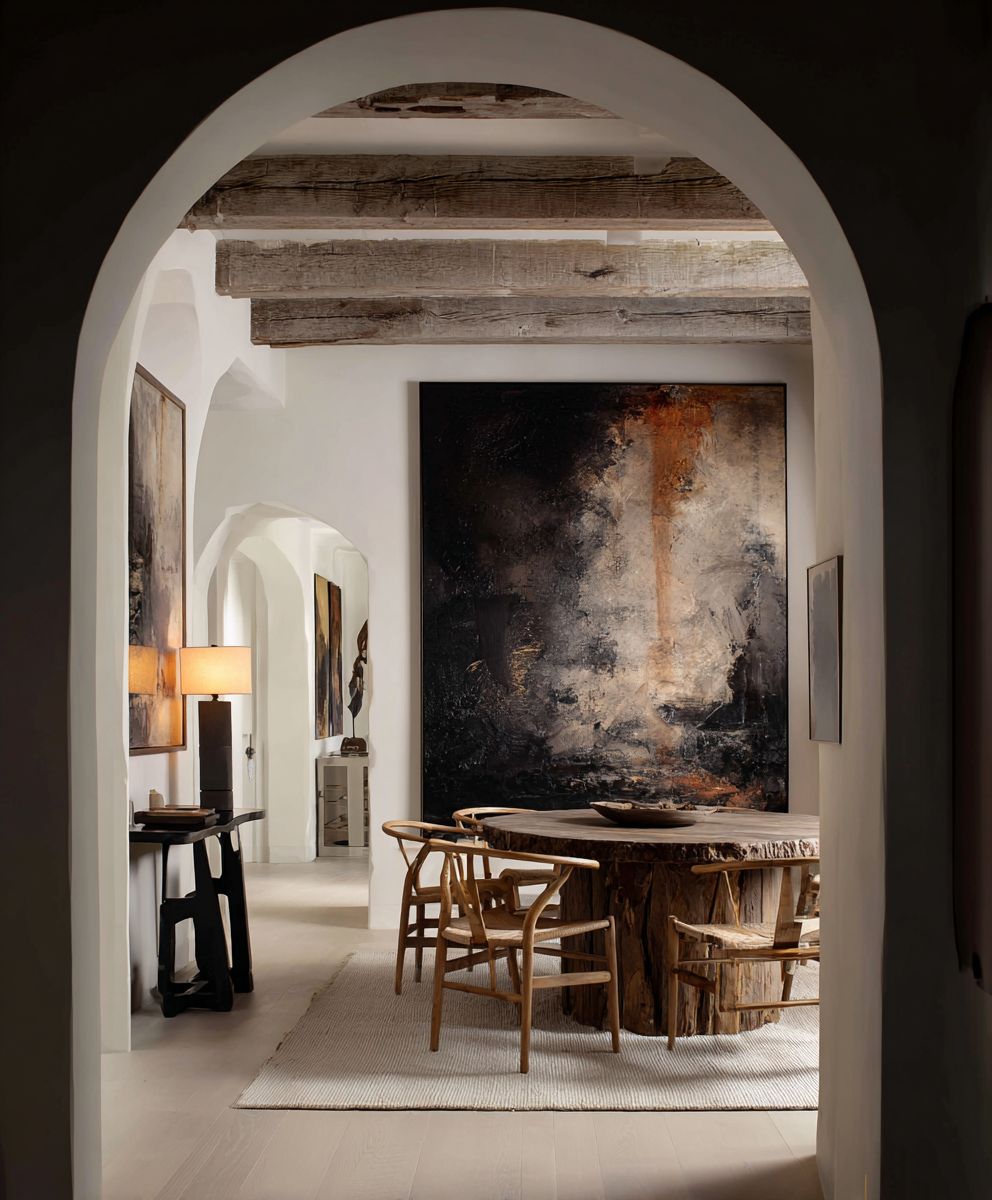 A sophisticated and luxurious wabi-sabi inspired dining room, viewed through a dark, elegant arched entryway. The room features a dramatic, oversized abstract painting on the far wall, with rich, textured dark brown and black tones blending into subtle hints of rust or amber, creating a profound, moody atmosphere. Below the artwork, a grand, organic-shaped round dining table made from raw, thick-cut wood with visible grain and imperfections is the centerpiece. It is surrounded by classic Wishbone chairs with woven seats, adding a touch of Scandinavian modernism. The ceiling has exposed beams, and the walls are a soft, off-white. To the left, a partially visible arched doorway leads to another room with a white door. The lighting is soft and diffused, with a warm table lamp on a side console. The floor is covered by a light-colored, textured rug over light wood, emphasizing natural materials and a serene, minimalist aesthetic with dramatic contrast.