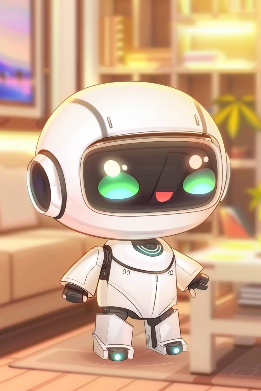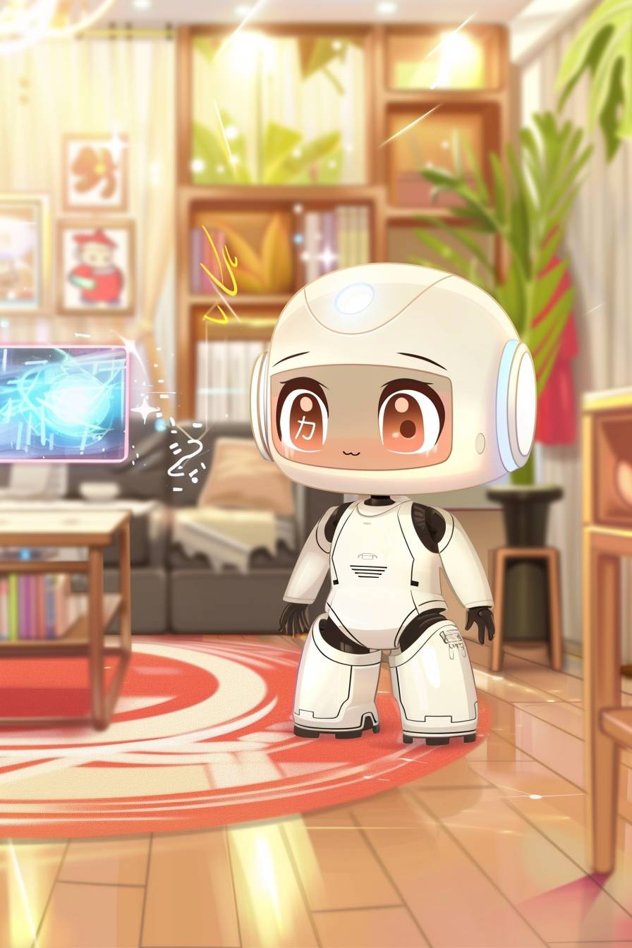 A futuristic robot companion in a sleek, modern home, interacting with a human, advanced AI features, warm and inviting setting --ar 2:3 --sref 616493366 --v 6.0