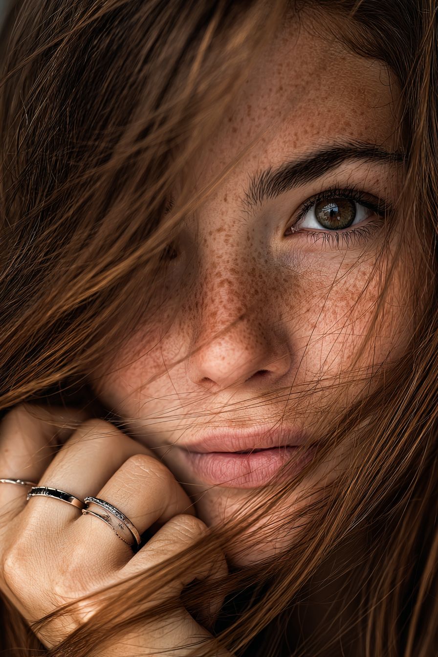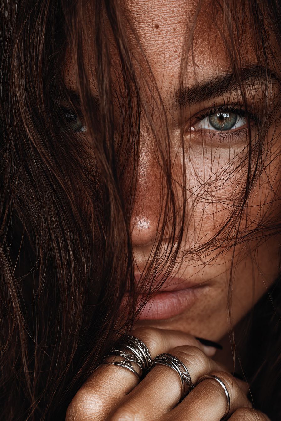 Create a raw, ultra-realistic close-up portrait of this woman with a beautiful body and striking feminine features. Faithfully use the facial features and hair from the submitted photo: harmonious face, naturally skin. The frame shows only one of her eyes peeking out from behind the slightly disheveled brown strands that fall across her face. Her right hand, adorned with silver rings, holds part of her hair. A beam of 100%face. Nailpolish is black. --ar 2:3 --v 7.0