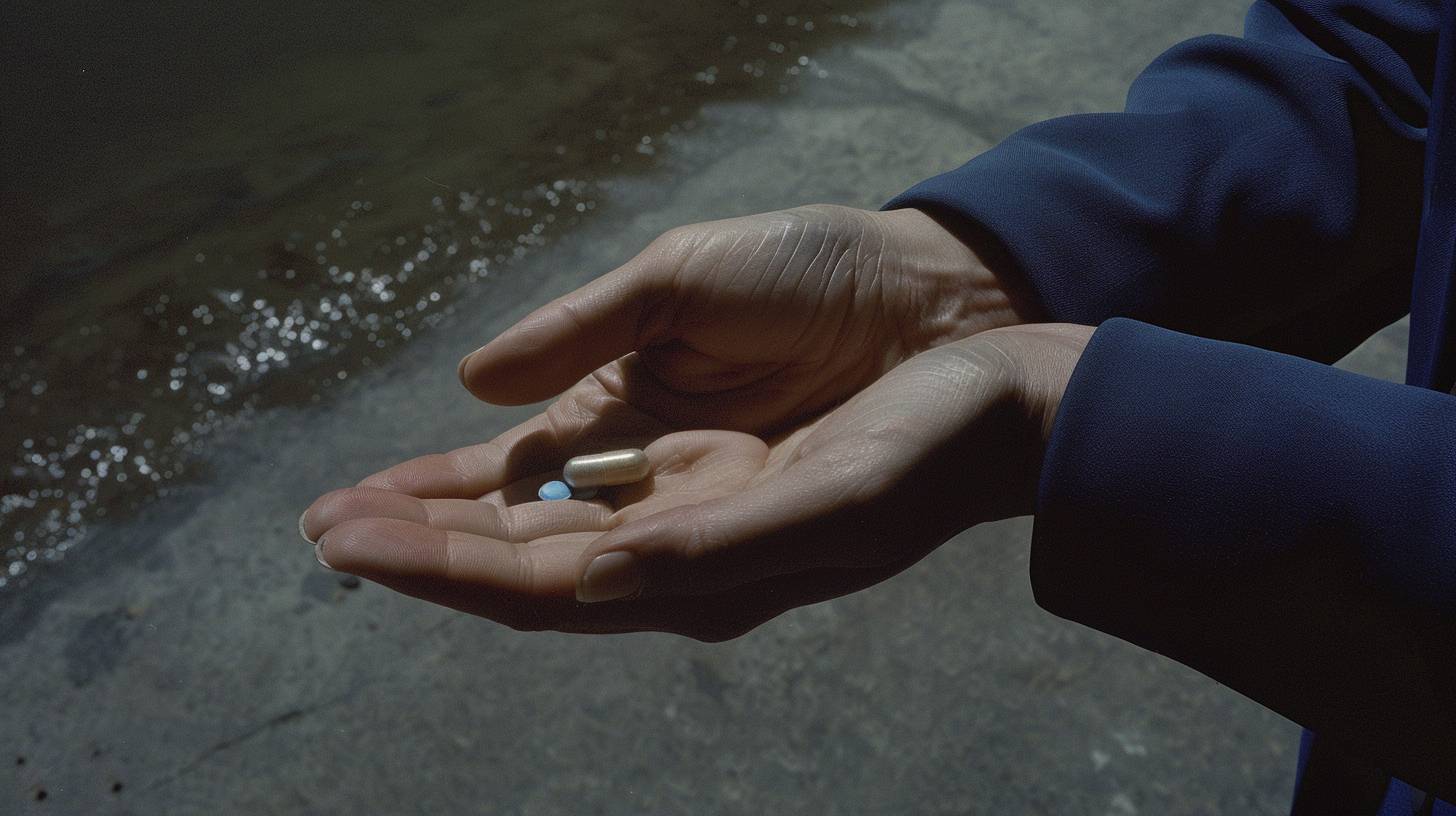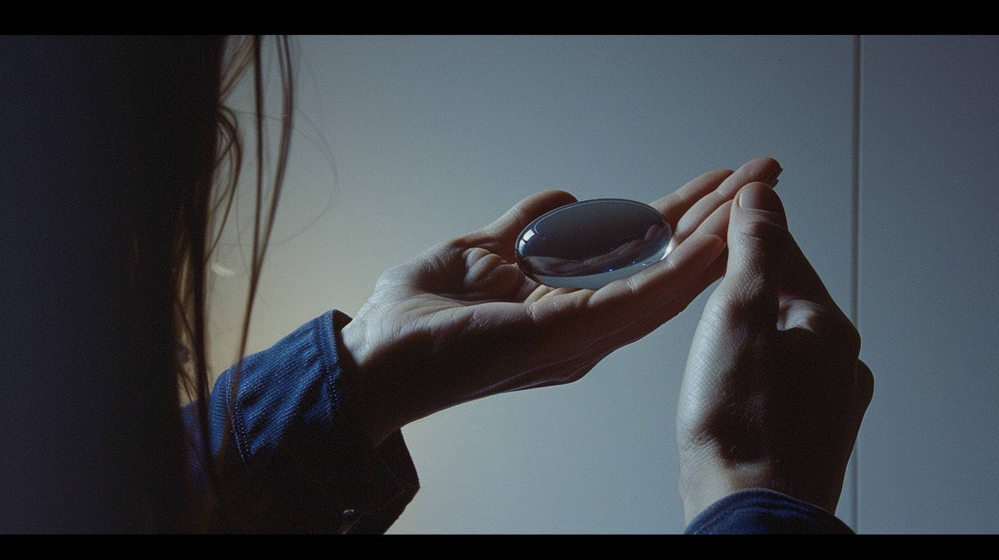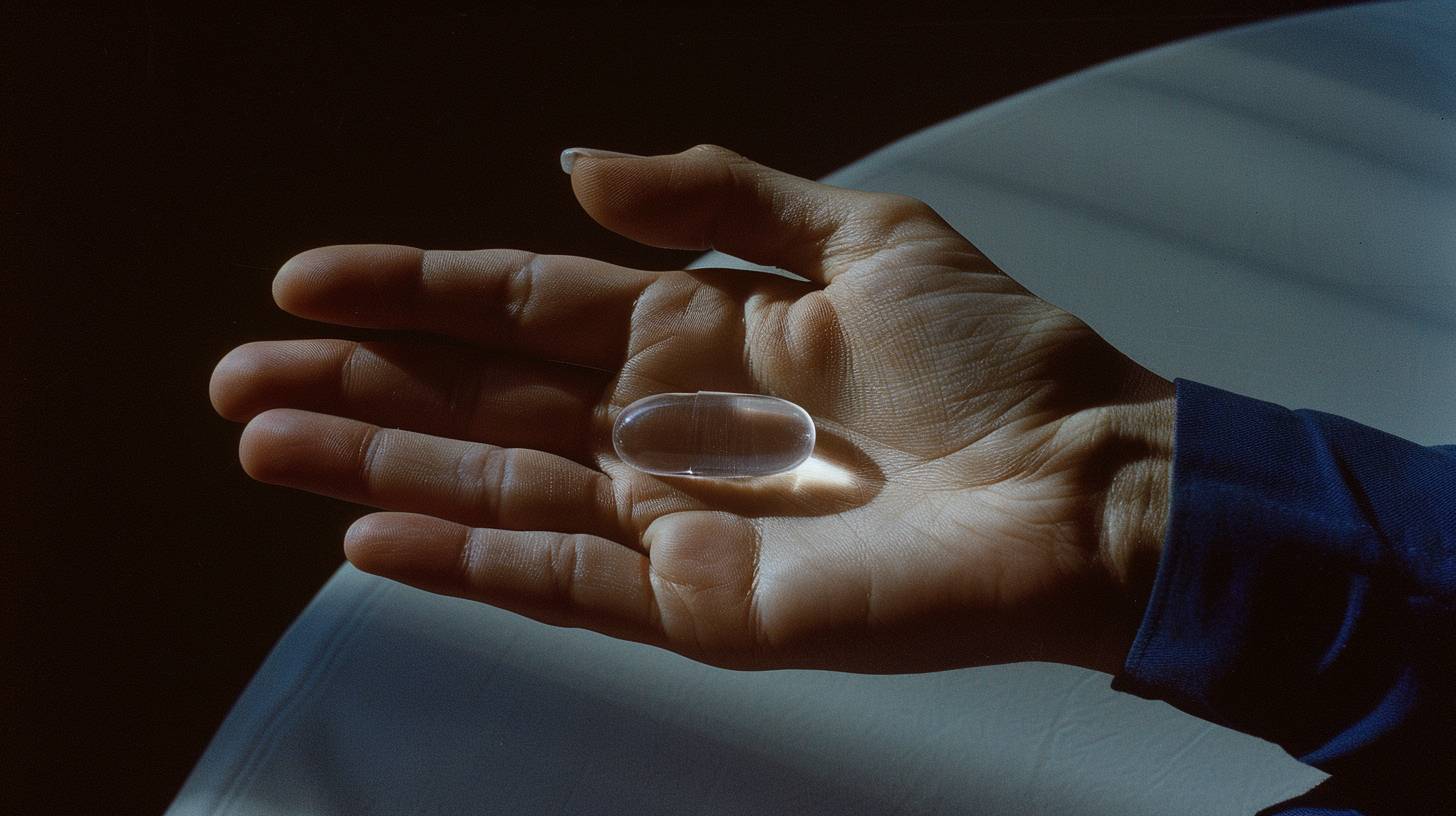 A cinematic close-up shot of a strange flying pill in a woman's palm
