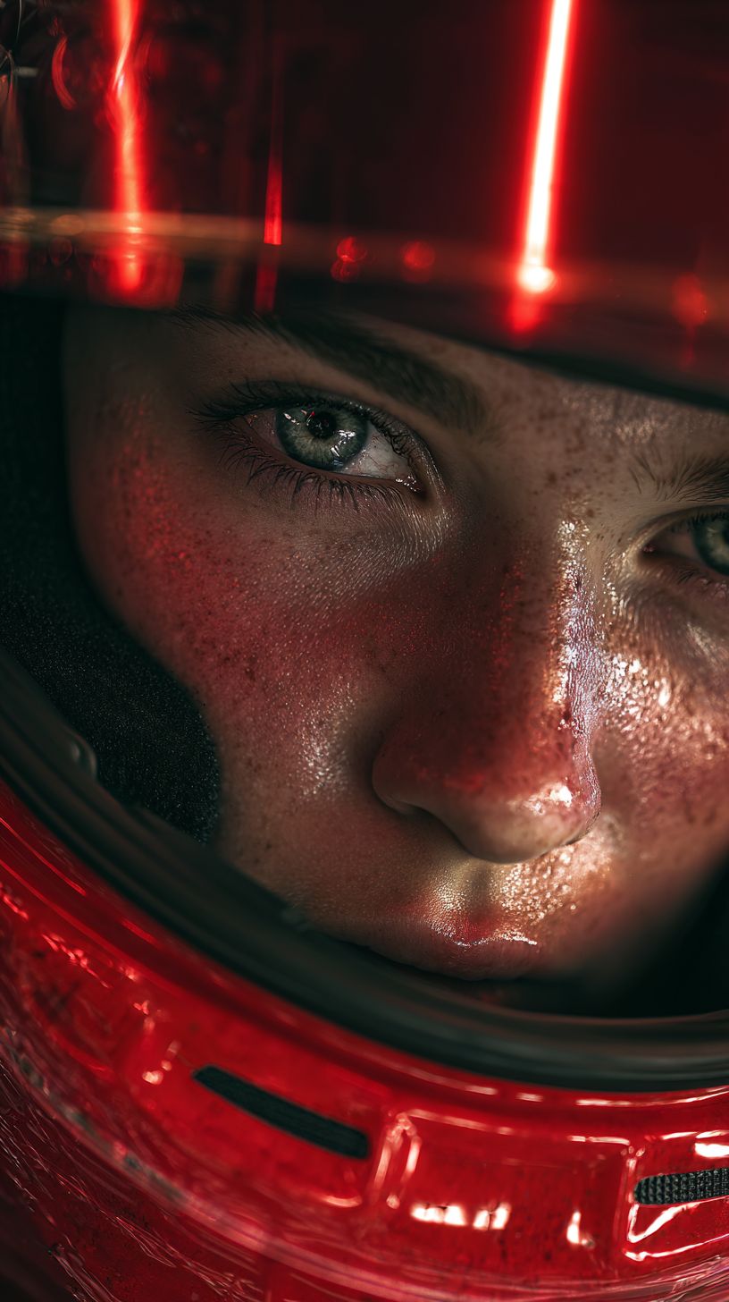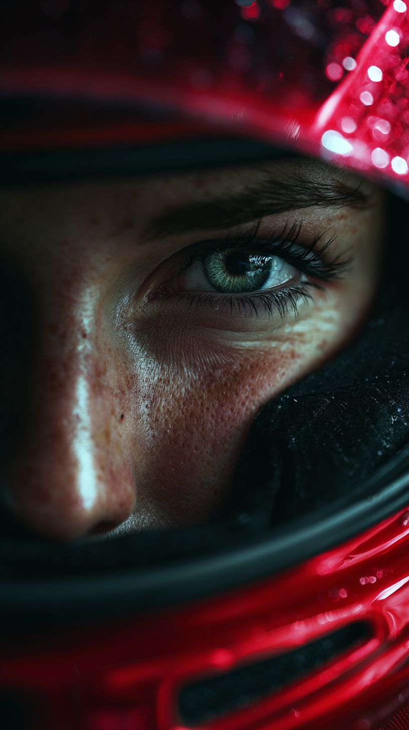 Extreme close-up portrait of a female race car driver in a red F1 helmet